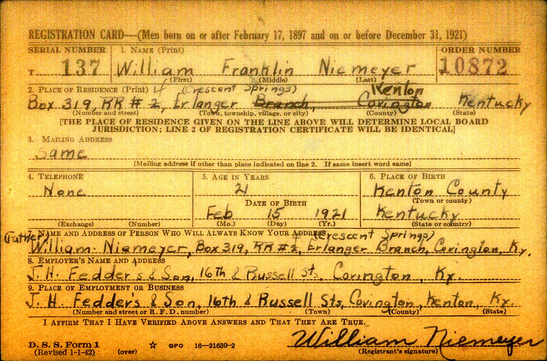 William F. Niemeyer was born in Crescent Springs, Kentucky, about six miles southwest of Cincinnati. His parents, Willie and Johanna Niemeyer, were of German origin, and Willie was the district salesman for a feed company. His parents were quiet people, hard working and strict Catholics. As a result, their son was of a quiet nature and perhaps a little shy, but also a naturally gifted athlete.