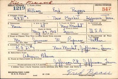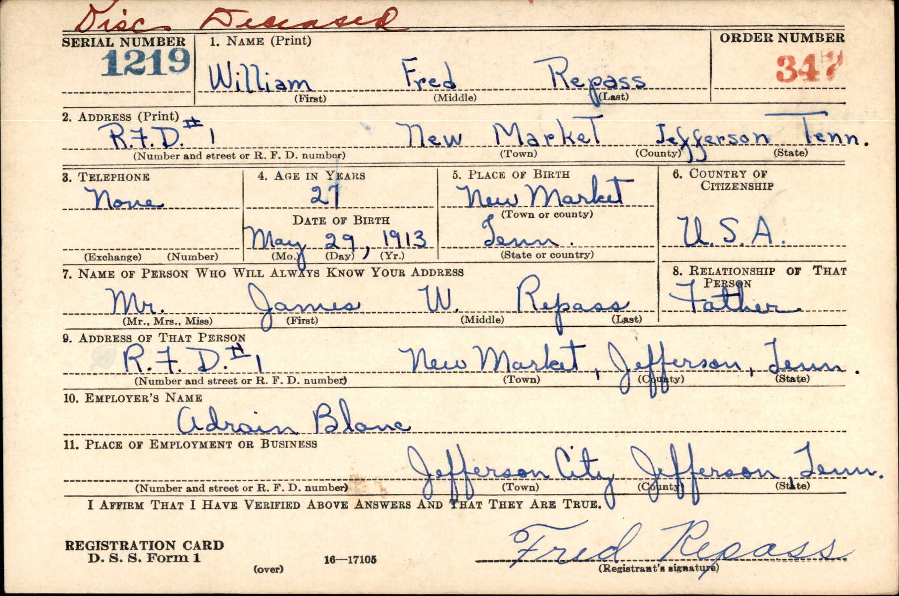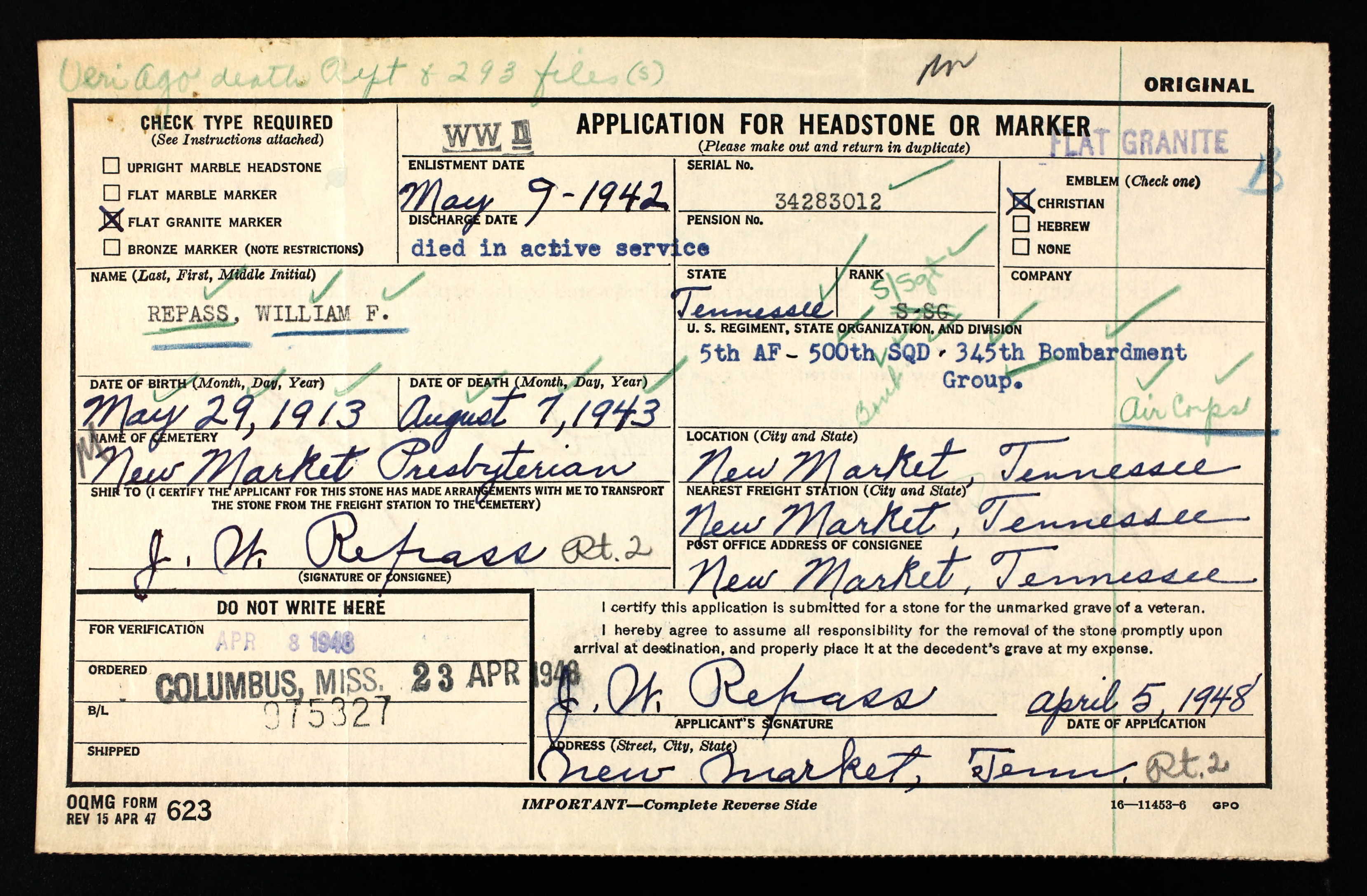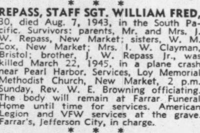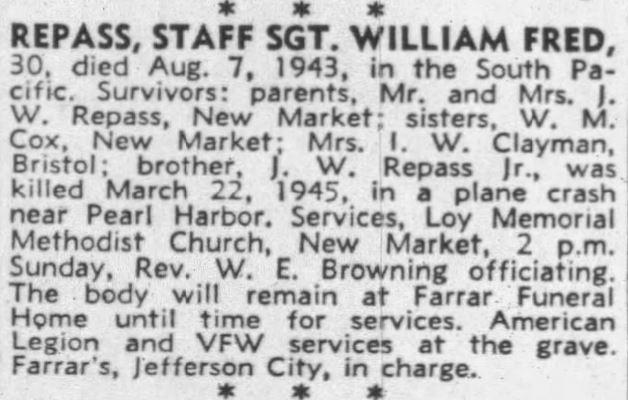 S/Sgt. William Fred Repass died non battle in the South Pacific. He was the son of James Winston Repass and Neva Blanche Elmore. He was a gunner in the Air Corps and was a passenger on the C-47-DL # 41-7733, nickname “Eager Beaver”.