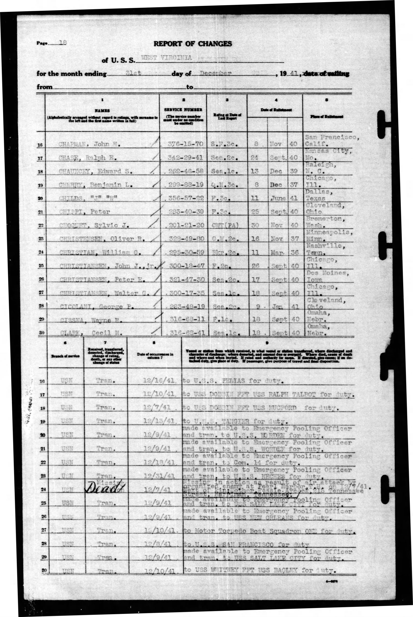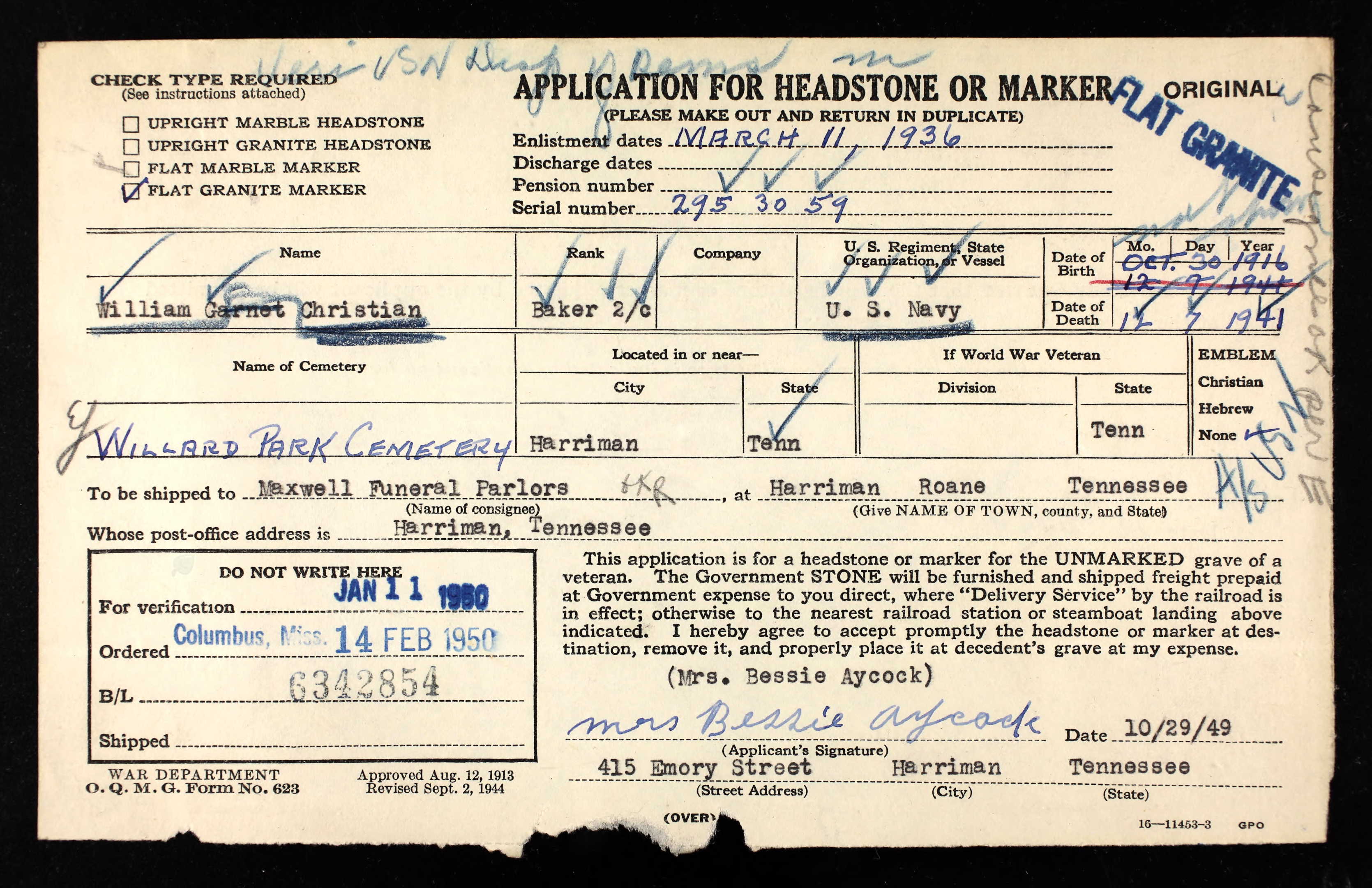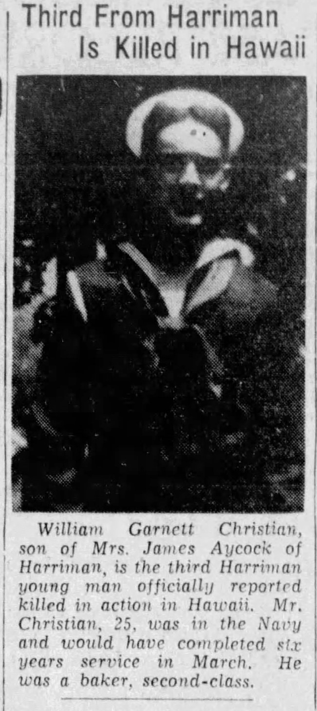 He was the first casualty from the Harriman, TN, area in WW II. Christian was shipped aboard the USS West Virginia BB-48. Moored alongside the USS Tennessee on Sunday, 7 December 1941, at Pearl Harbor, when the ship was repeatedly torpedoed and bombed by Japanese Naval forces. He lost his life during the attack.
