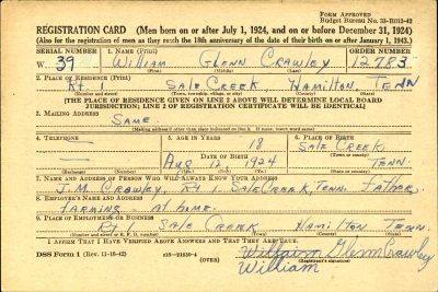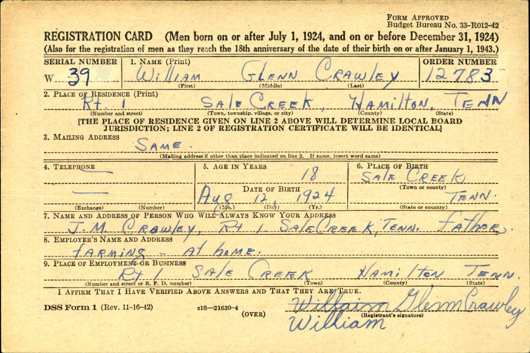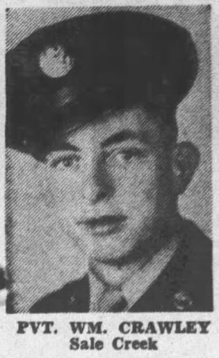 Pvt. W. Glenn Crawley, son of Mr. and Mrs. J.M. Crawley, Sale Creek, was killed in action June 6, D-Day in France. Pvt. Crawley is survived by his parents, four brothers, Roy, M.W. and Eugene Crawley of Sale Creek and Pfc. Merle Crawley, Fort Leonard Wood, Mo., and five sisters, Mrs. L.J. Slatton, Mrs. William E. Woodward, Misses Wilma, Janette and Dorotha Deane Crawley.