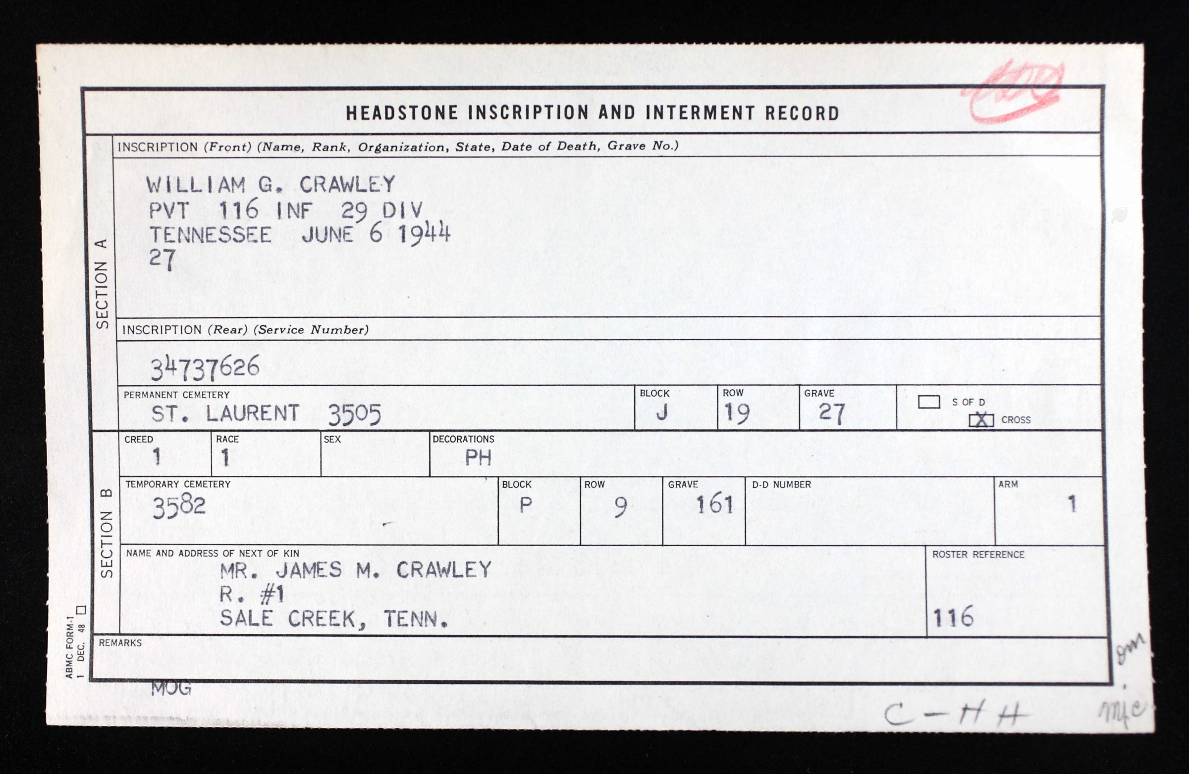 Private William G. Crawley #34737626 US Army was assigned to the 116th Infantry Regiment, 29th Infantry Division. The division landed at Omaha Beach on the 6th of June 1944, D-Day. Private Crawley was killed in action on this date.