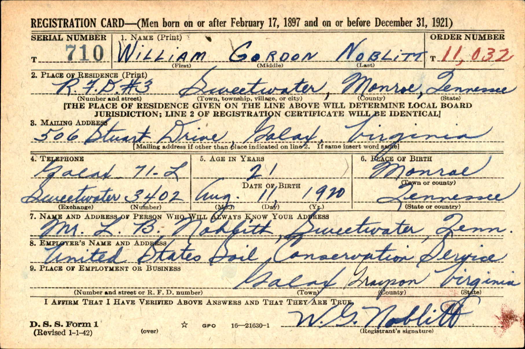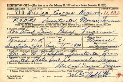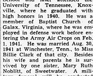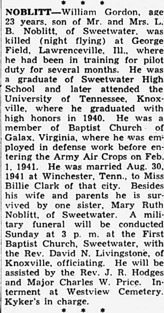 William Gordon Noblitt, age 23 years, son of Mr. and Mrs. L.B. Noblitt, of Sweetwater, was killed (night flying) at George Field, Lawrenceville, Ill., where he had been in training for pilot duty for several months. He was a graduate of Sweetwater High School and later attended the University of Tennessee, Knoxville, where he graduated with high honors in 1940. He was a member of Baptist Church of Galax, Virginia, where he was employed in defense work before entering the Army Air Corps on Feb. 1, 1941. He was married Aug. 30, 1941 at winchester, Tenn., to Miss Billie Clark of that city. Besides his wife and parents he is survived by one sister, Mary Ruth Noblitt, of Sweetwater.