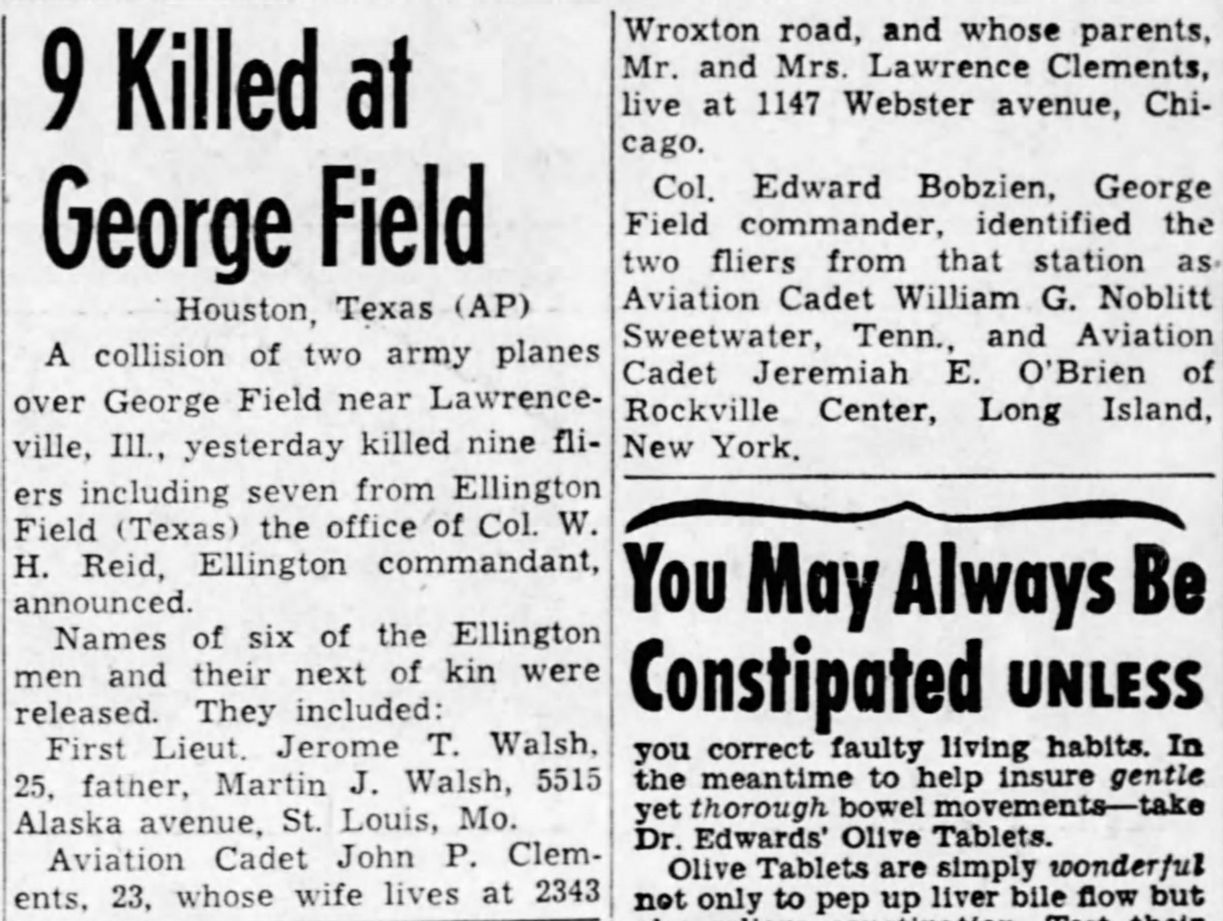 A collision of two army planes over George Field near Lawrenceville, Ill., killed nine fliers including seven from Ellington Field (Texas) the office of Col. W.H. Reid, Ellington commandant, announced. Names of six of the Ellington men and their next of kin were released. They included: First Lieut. Jerome T. Walsh, 25, father, Martin J. Walsh, Alaska avenue, St. Louis, Mo.; Aviation Cadet John P. Clements, 23, whose wife lives at 2343 Wroxton road, and whose parents, Mr. and Mrs. Lawrence Clements, live at 1147 Webster avenue, Chicago.