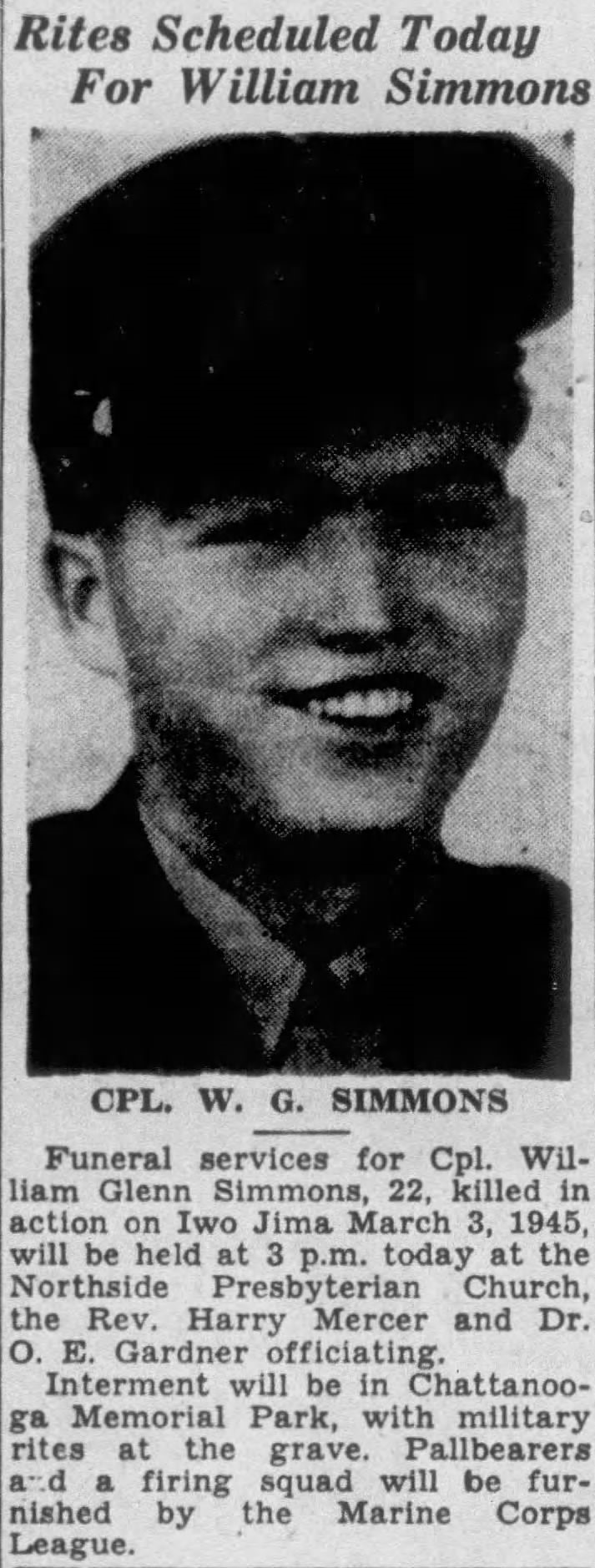 Cpl. William G. Simmons, 22, son of Mr. and Mrs. Noble J. Simmons, 1614 Hixson Pike, was reported killed March 3 in action in a recent invasion in the Pacific theater.