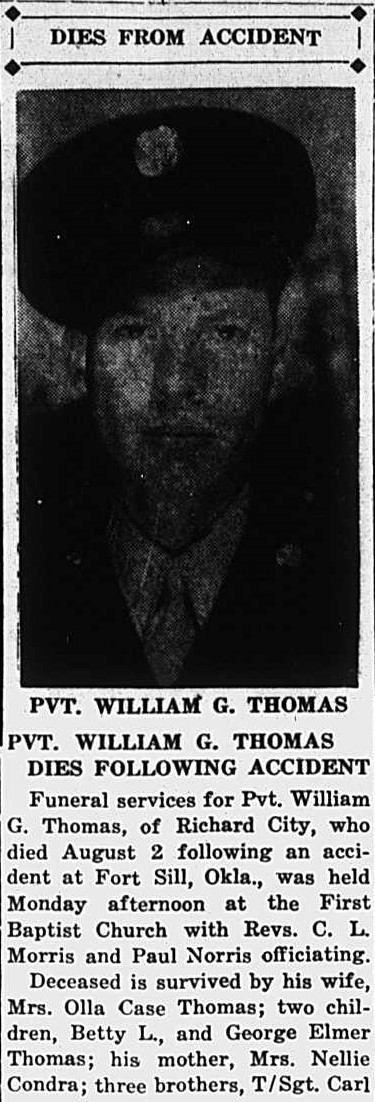 Funeral services for Pvt. William G. Thomas, of Richard City, who died August 2 following an accident at Fort Sill, Okla., was held Monday afternoon at the First Baptist Church.