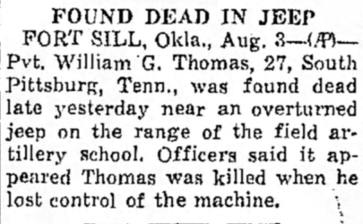Found dead in Jeep. Fort Sill, Okla., Aug. 3 – Pvt. William G. Thomas, 27, South Pittsburg, Tenn., was found dead late yesterday near an overturned jeep on the range of the field artillery school. Officers said it appeared that Thomas was killed when he lost control of the machine.