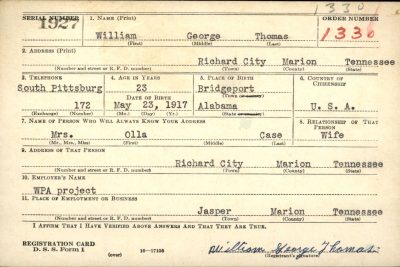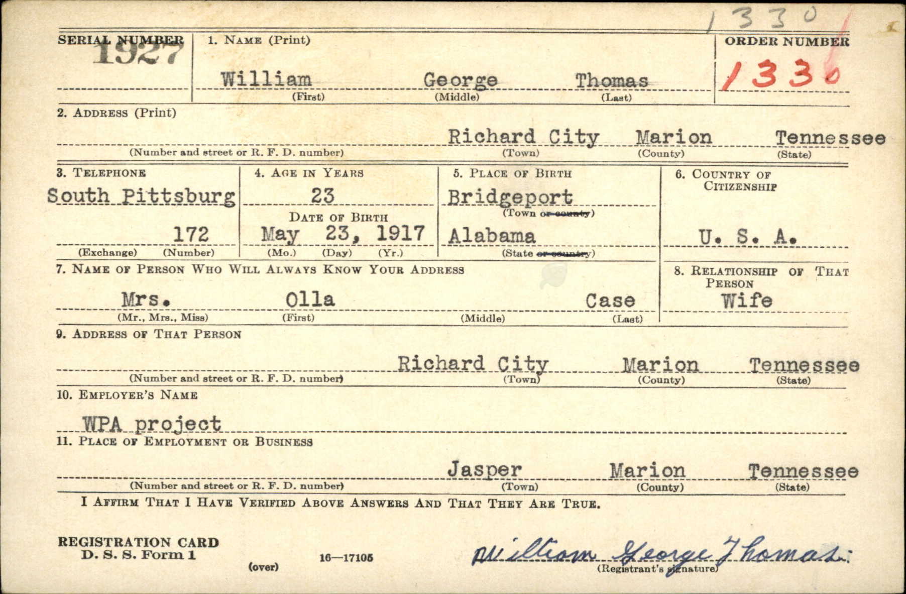 William George Thomas was born 23 May 1917 in Alabama to Louis Elmer Thomas and Nellie Jane Carter. He was married to Olla Mae Case and father of George Elmer Thomas