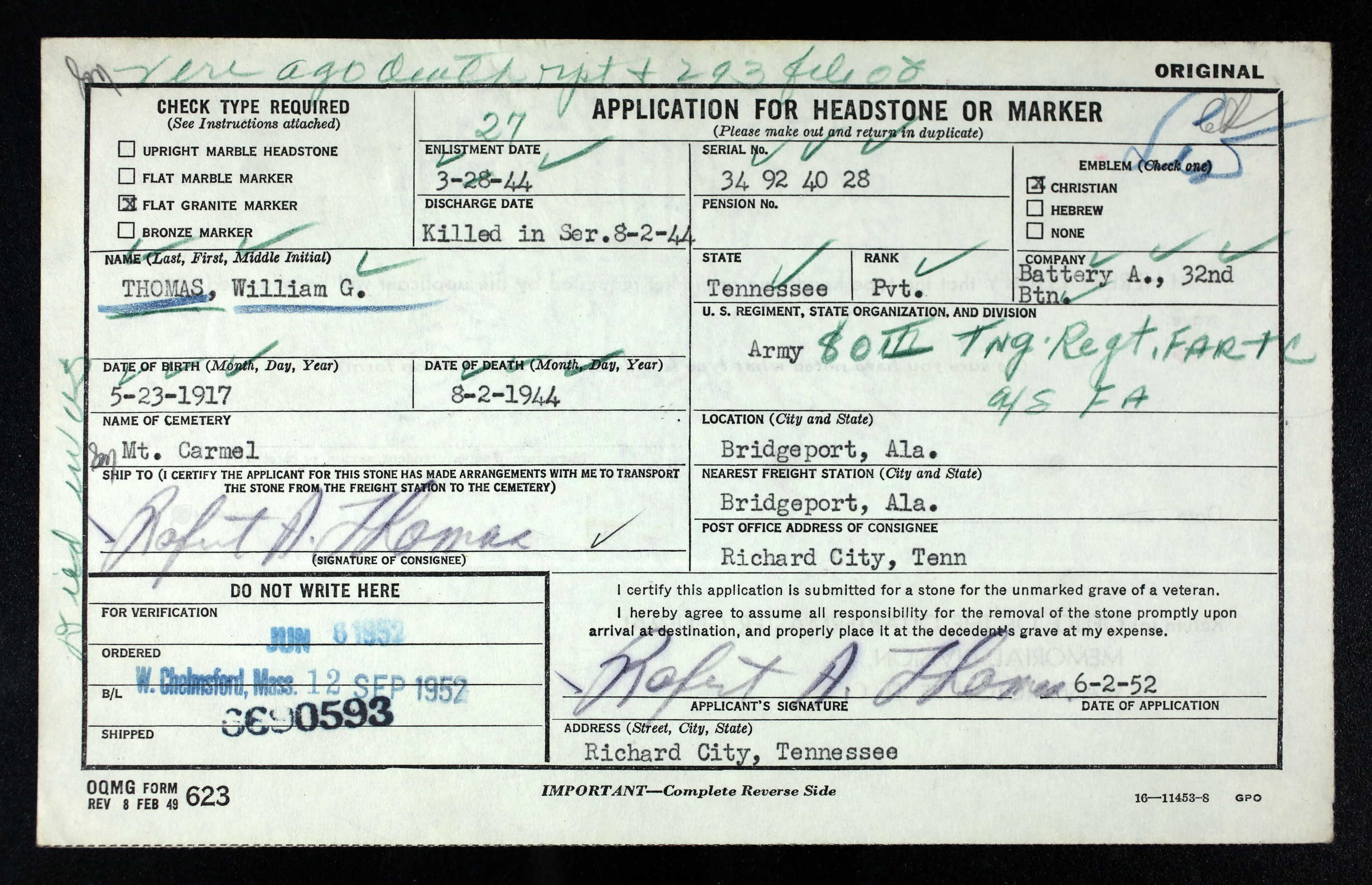 Pvt Thomas is buried at Mount Carmel Cemetery, Bridgeport, Jackson County, Alabama