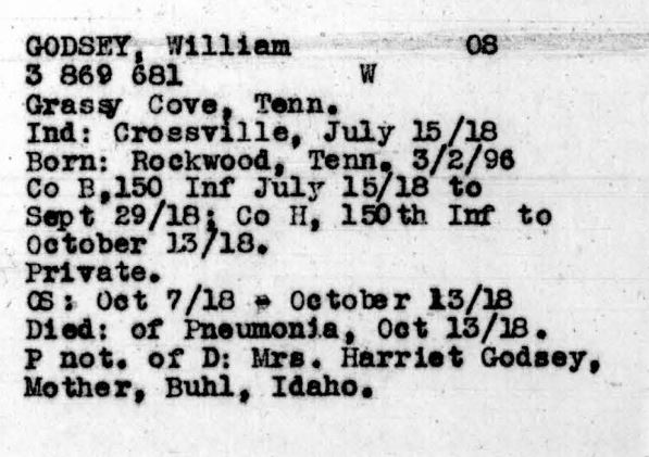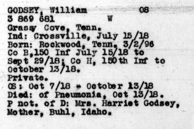 Pvt Godsey died of pneumonia and is listed on the Tablets of the Missing, Suresnes American Cemetery, Suresnes, France.