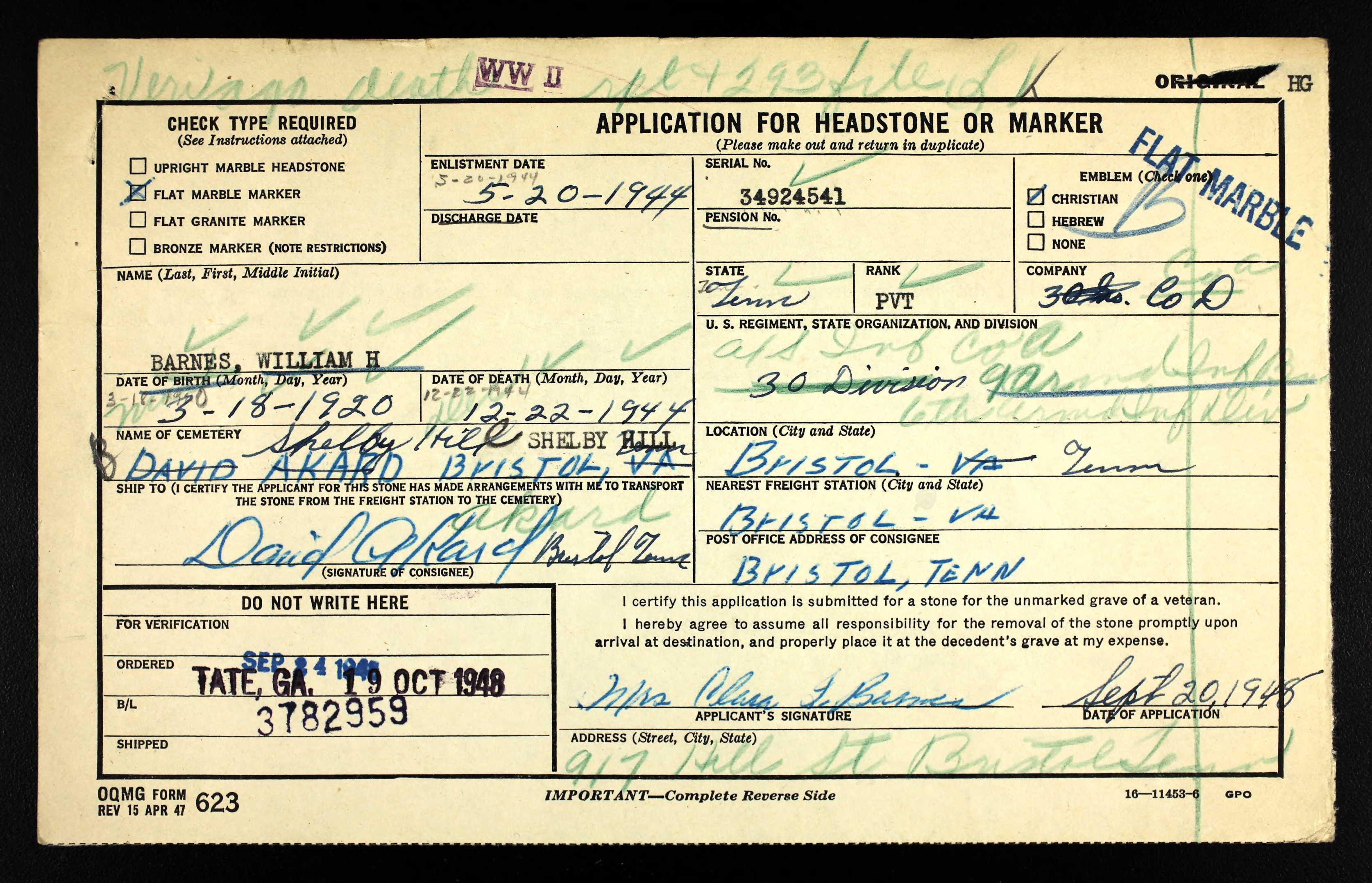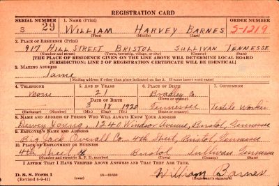 William Harvey Barnes was born on 18 March 1920 in Bradley County, Tennessee to Joseph D. Barnes and Nannie Saylor.