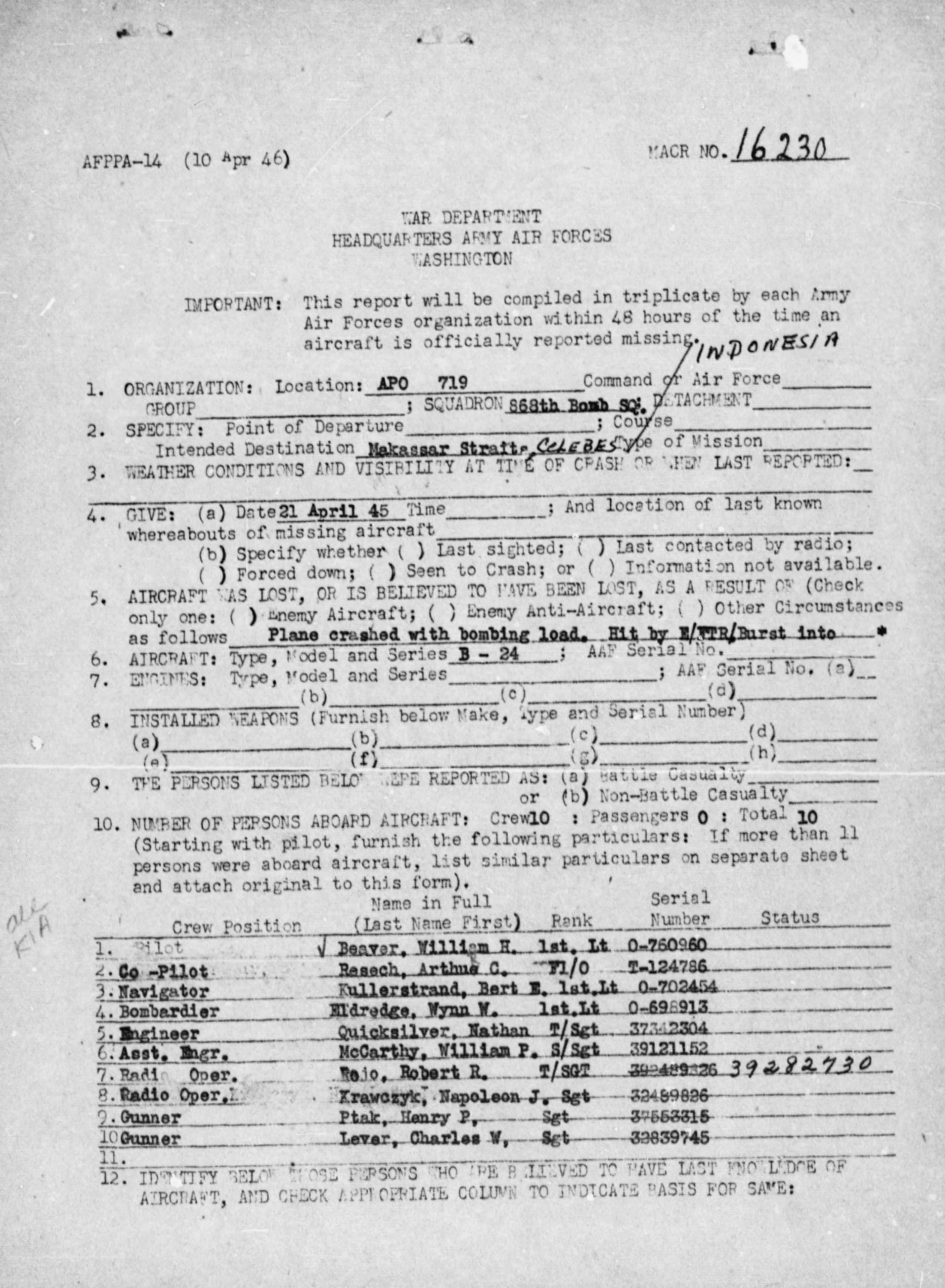 The airplane´s (B-24) destination was Makassar Straits Celebes in Indonesia. The plane was hit by enemy fighters and crashed with bombing load into the water about 6 miles from Makassar Town.