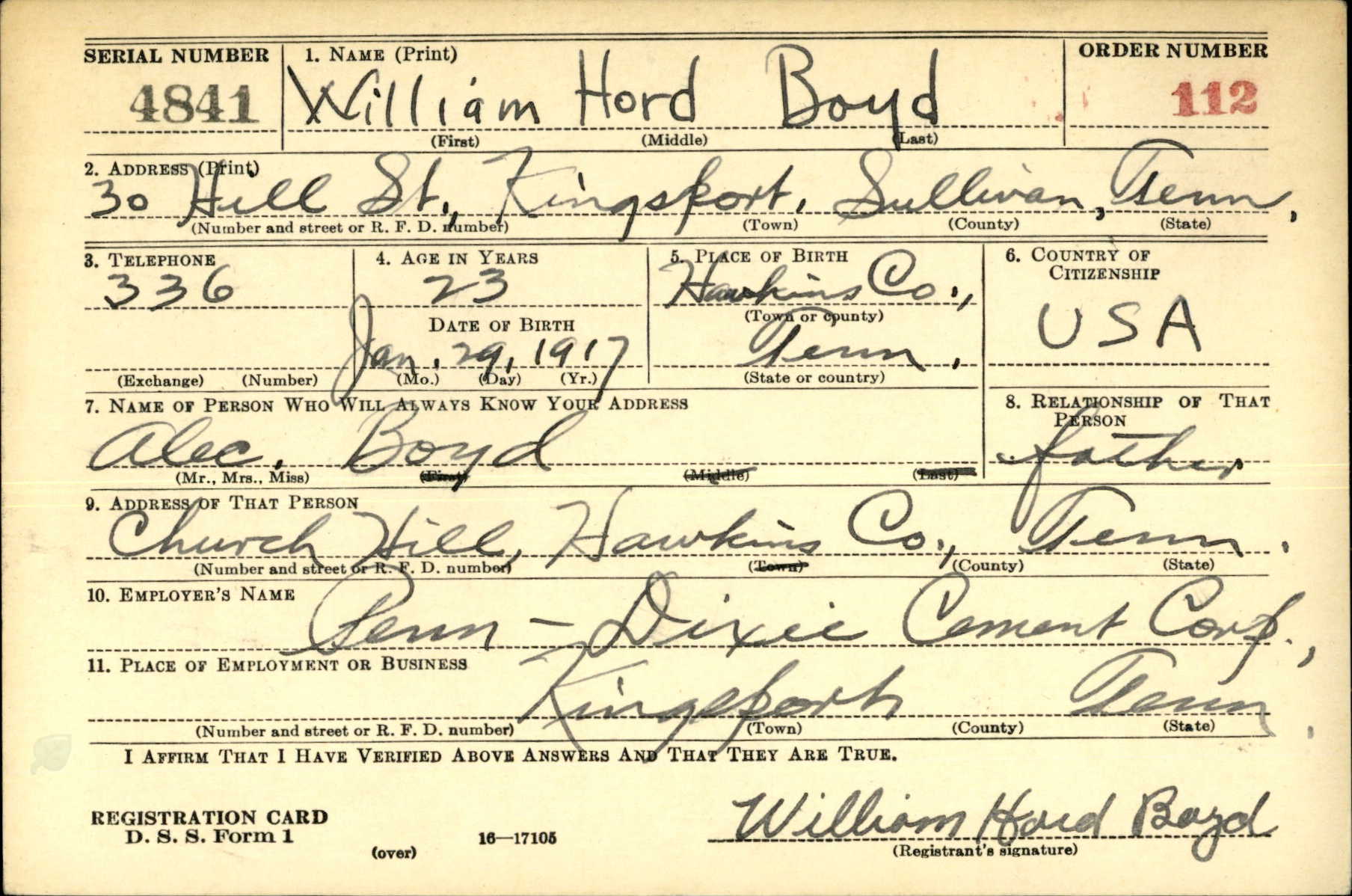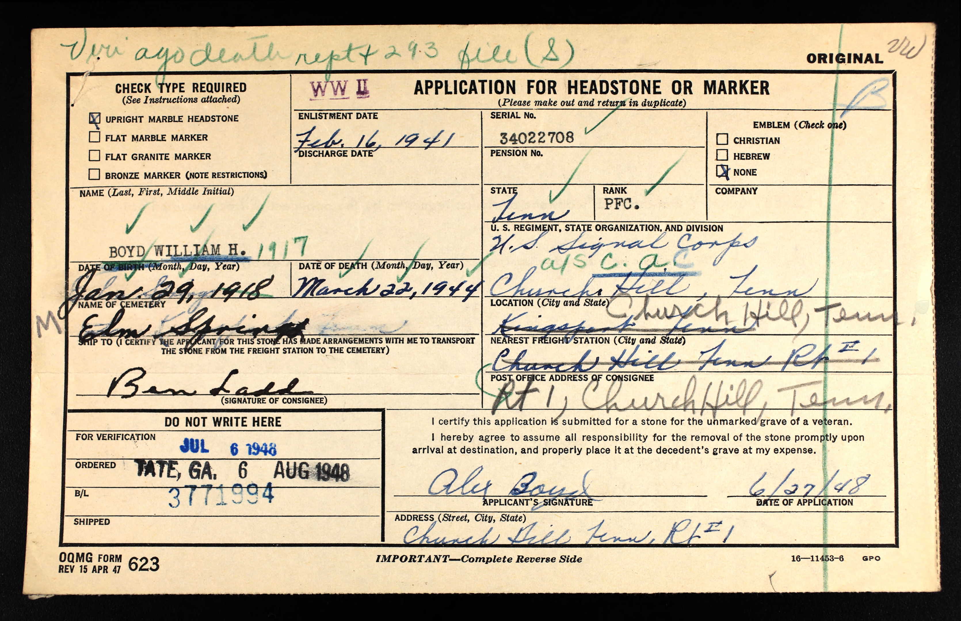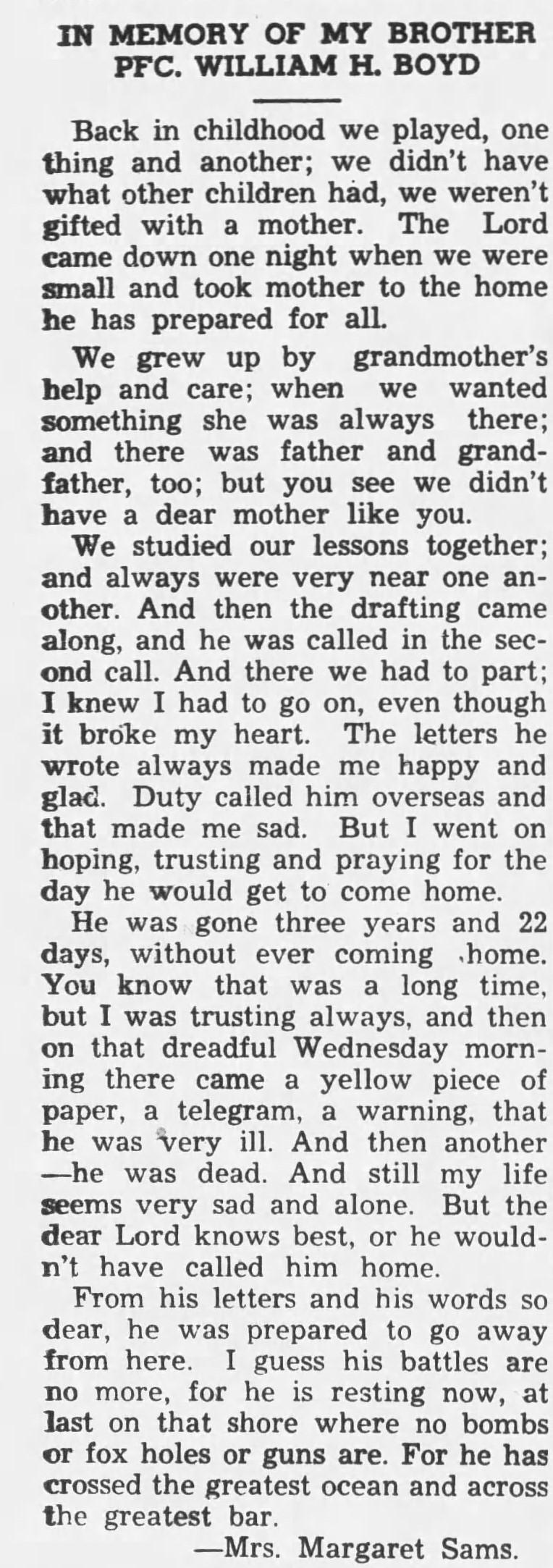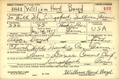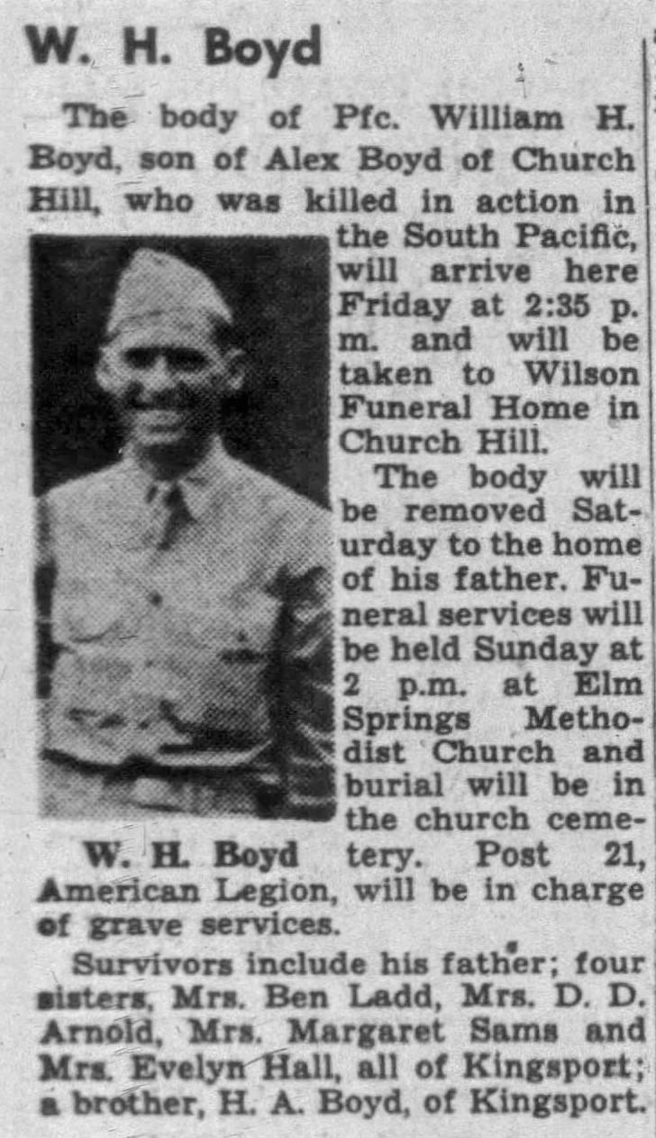 The Kingsport Times, 9 April 1944 , Church Hill, Tennessee – PFC William Boyd, who became seriously ill on March 20, died March 22 in New Georgia Island, according to the message received March 28 by his father, Alex Boyd. PFC Boyd, who has seen three years and 22 days of service, had spent two years and 22 days overseas. PFC saw action in Australia, New Guinea, Guadalcanal and New Georgia Island. Surviving PFC Boyd are his father, Alex Boyd, step-mother Mrs. Alex Boyd; four sisters, Mrs. Ben Ladd, Mrs. B.E. Hall, Mrs. B.D. Arnold, and Mrs. Mack Sams, Church Hill and one brother, Private Andrew J. Boyd, United States Army.