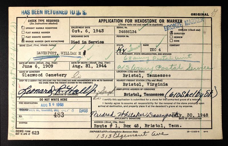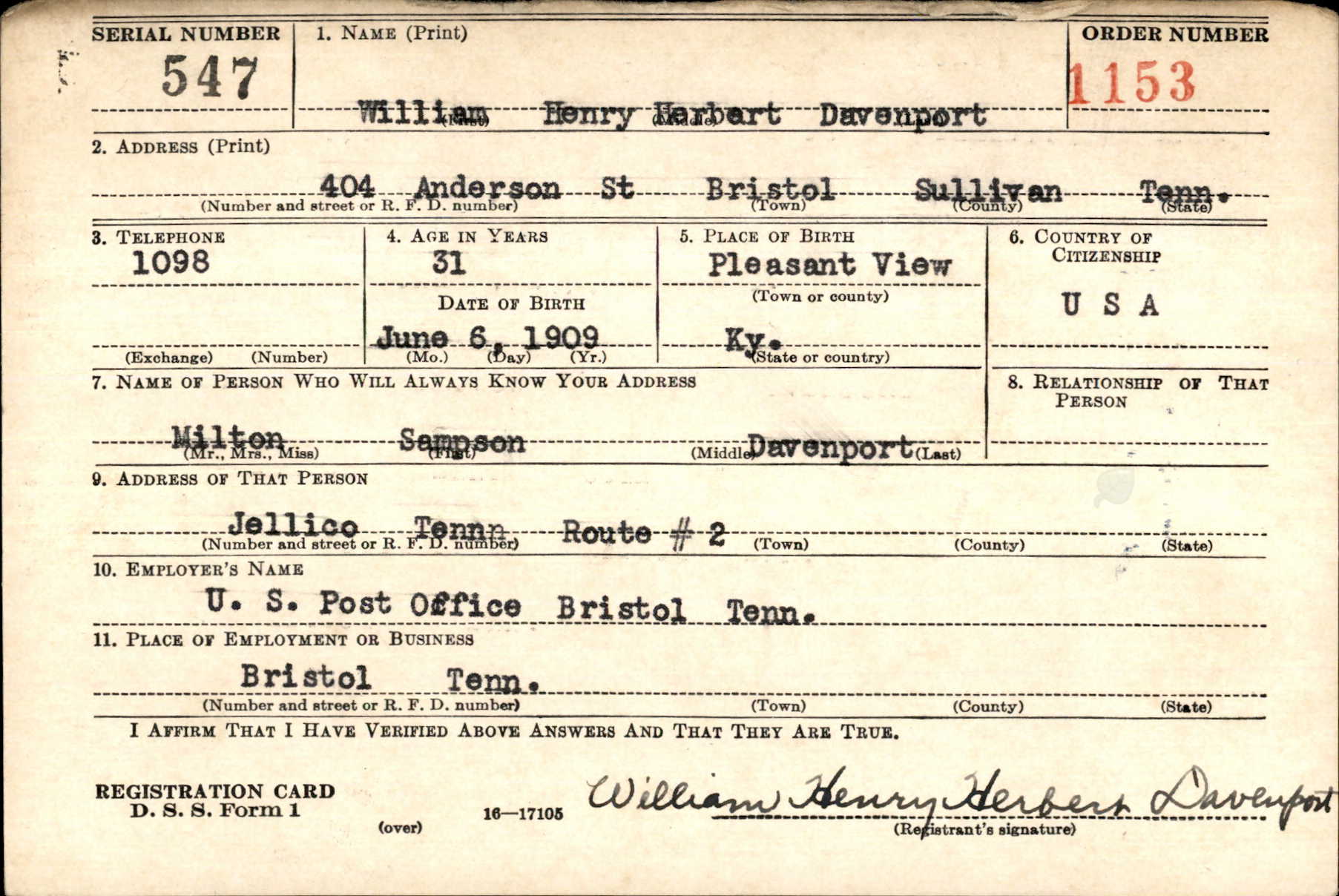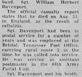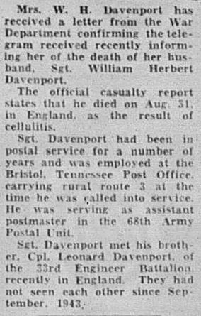 William Herbert Davenport was born at Pleasant View in Kentucky on 6 June 1909, to Milton Sampson “Melt” Davenport and Judy Evaline “Eva” Davenport. He lived much of his life in Bristol, Tennessee, where he was a mail carrier. He enlisted in the U.S. Army during World War II and served as a postal clerk with the Army’s 68th Postal Unit of the Army Postal Service. He died in active service on August 31, 1944, from non-battle causes in England of cellulitus.