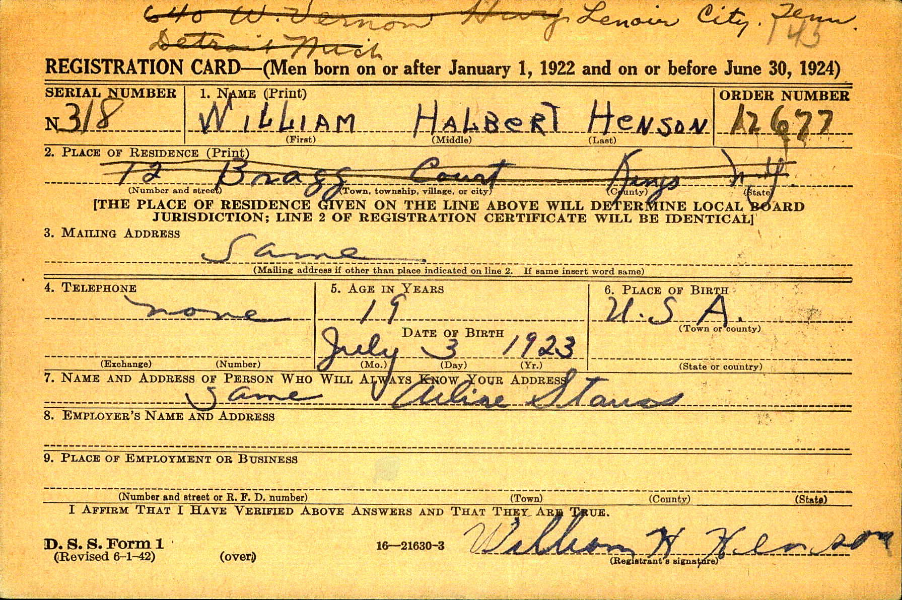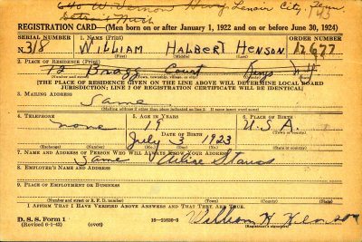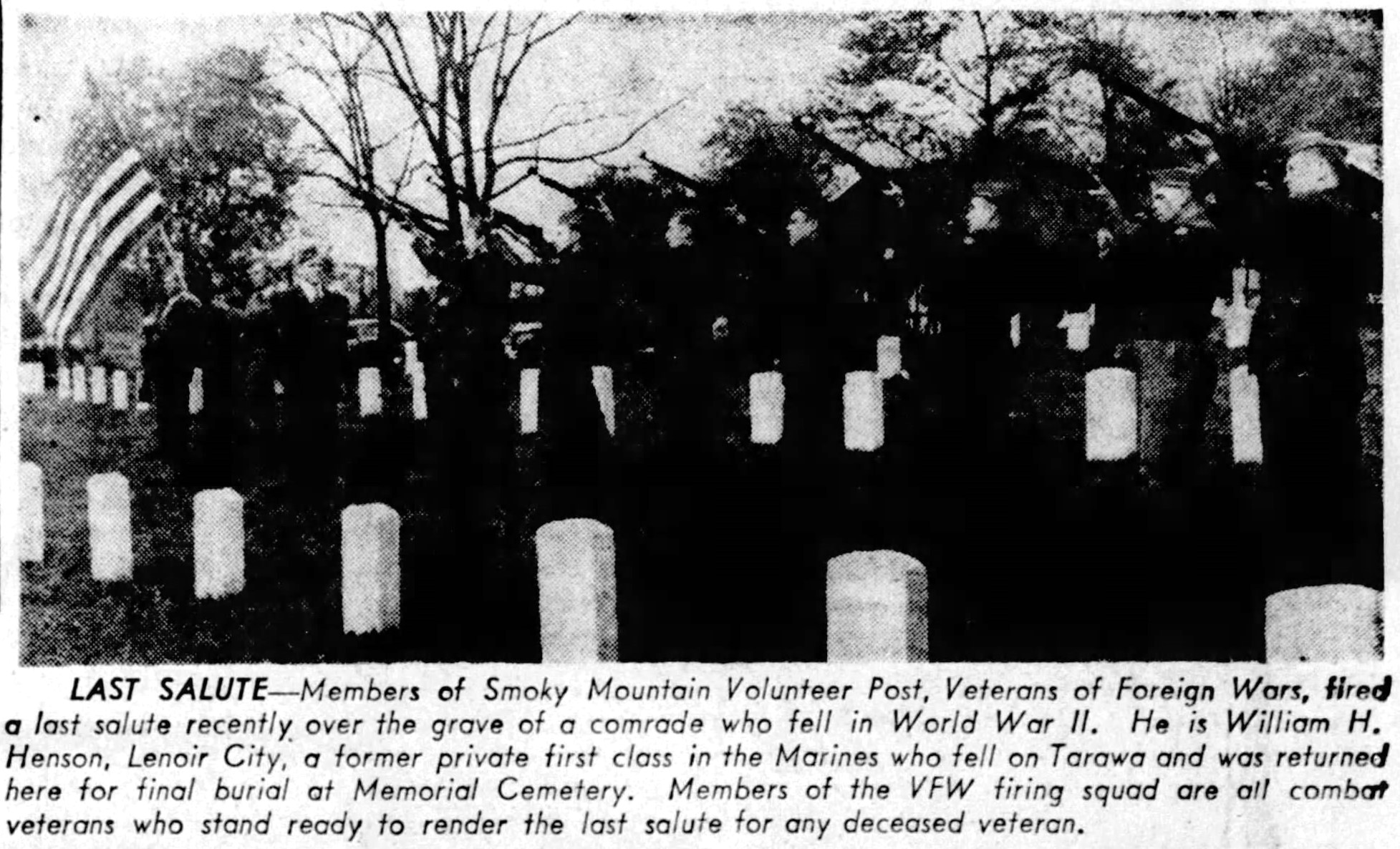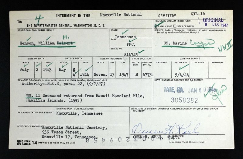 He was killed in action on 4 May 1944 on Tarawa. PFC Henson was returned from Hawaii Homelani Hilo, Hawaiian Islands in 1947.