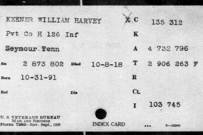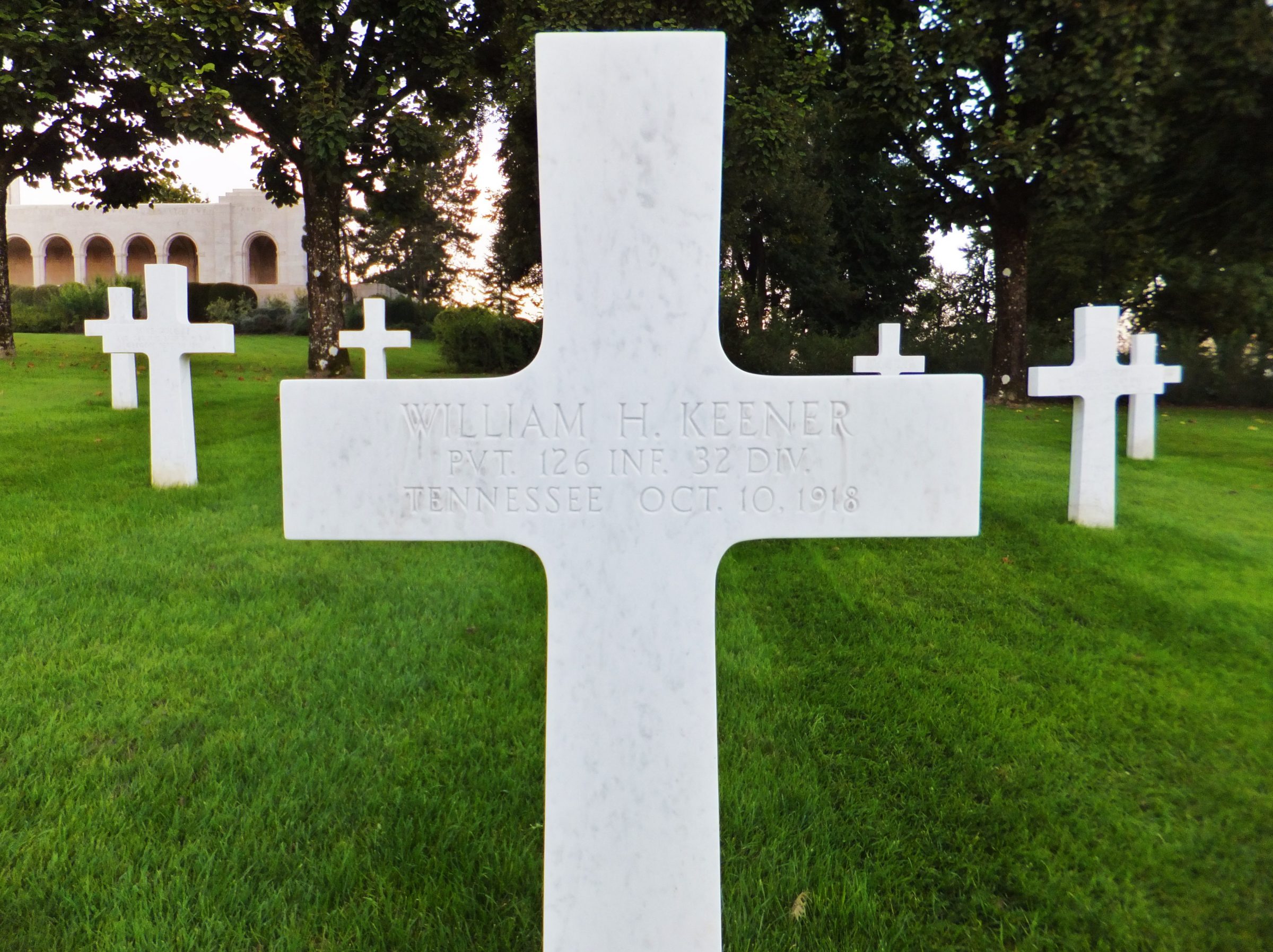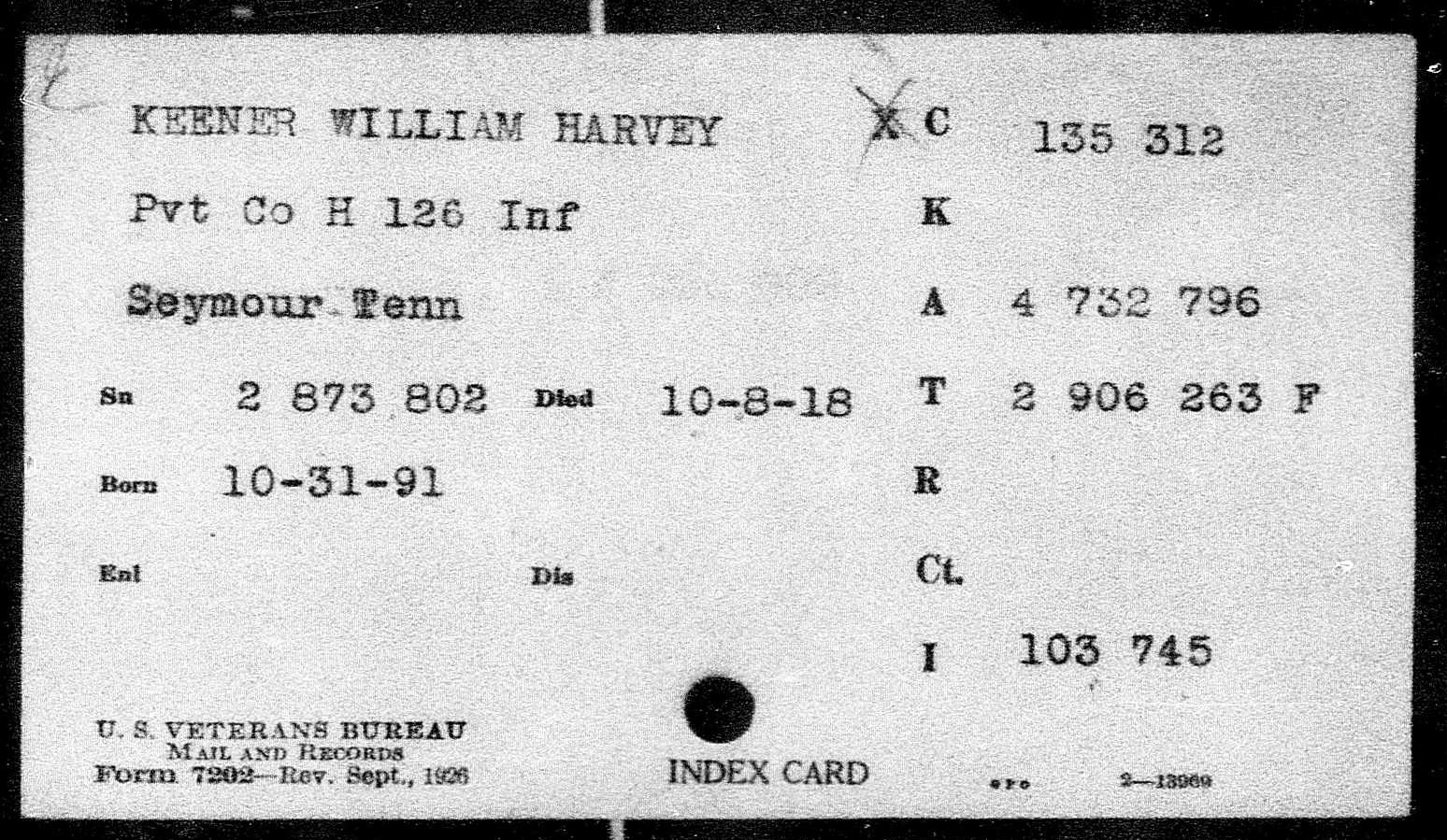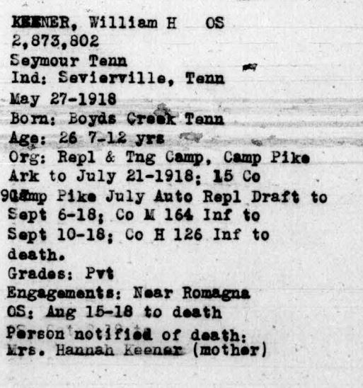 William Harvey Keener was born 31 October 1891 in Boyds Creek, Tennessee to Joseph Abraham Keener and Hannah Christine Clark. He was a Private in the 126th Infantry Regiment, 32nd Division. He died on 10 October 1918.
