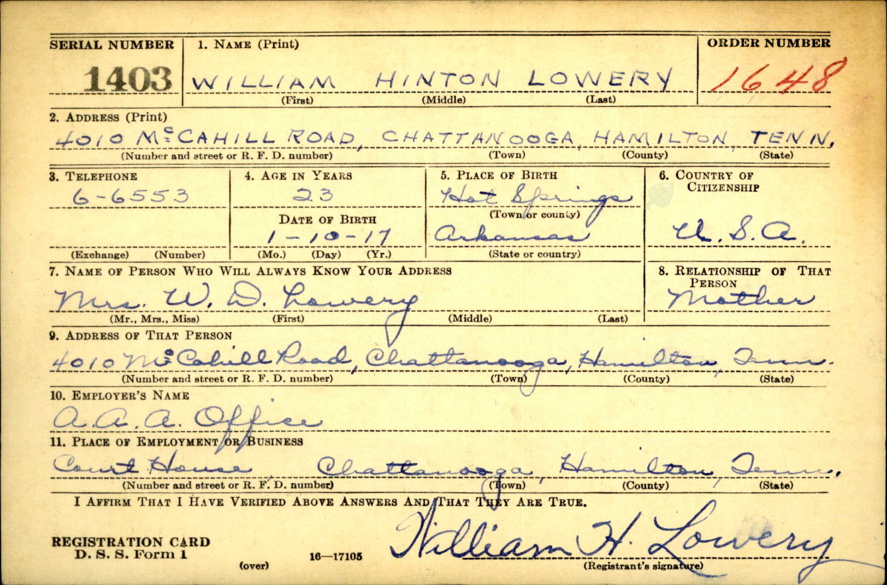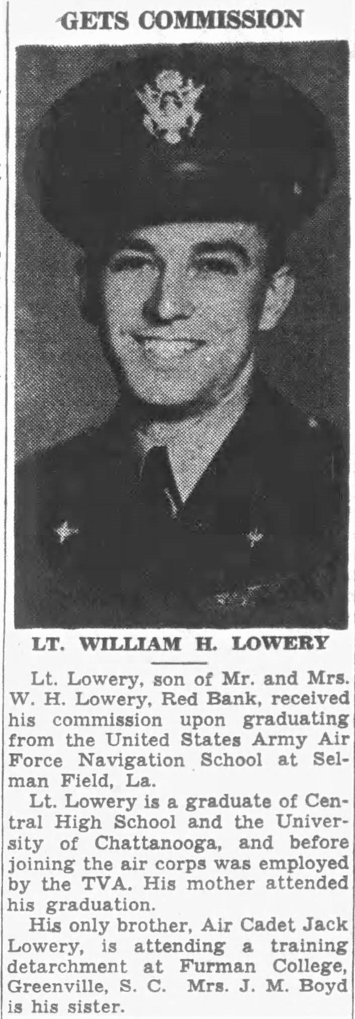 William Hinton Lowery was born at Hot Springs, Arkansas , the son of William David Lowery and Camille Elizabeth Picchi. Brother of Mary Elizabeth Lowery and Jack Mathew Lowery. He received his commission upon graduating from the United States Army Air Force Navigation School at Selman Field, La. He was a graduate of Central High School and the University of Chattanooga, and before joining the air corps was employed by the TVA.