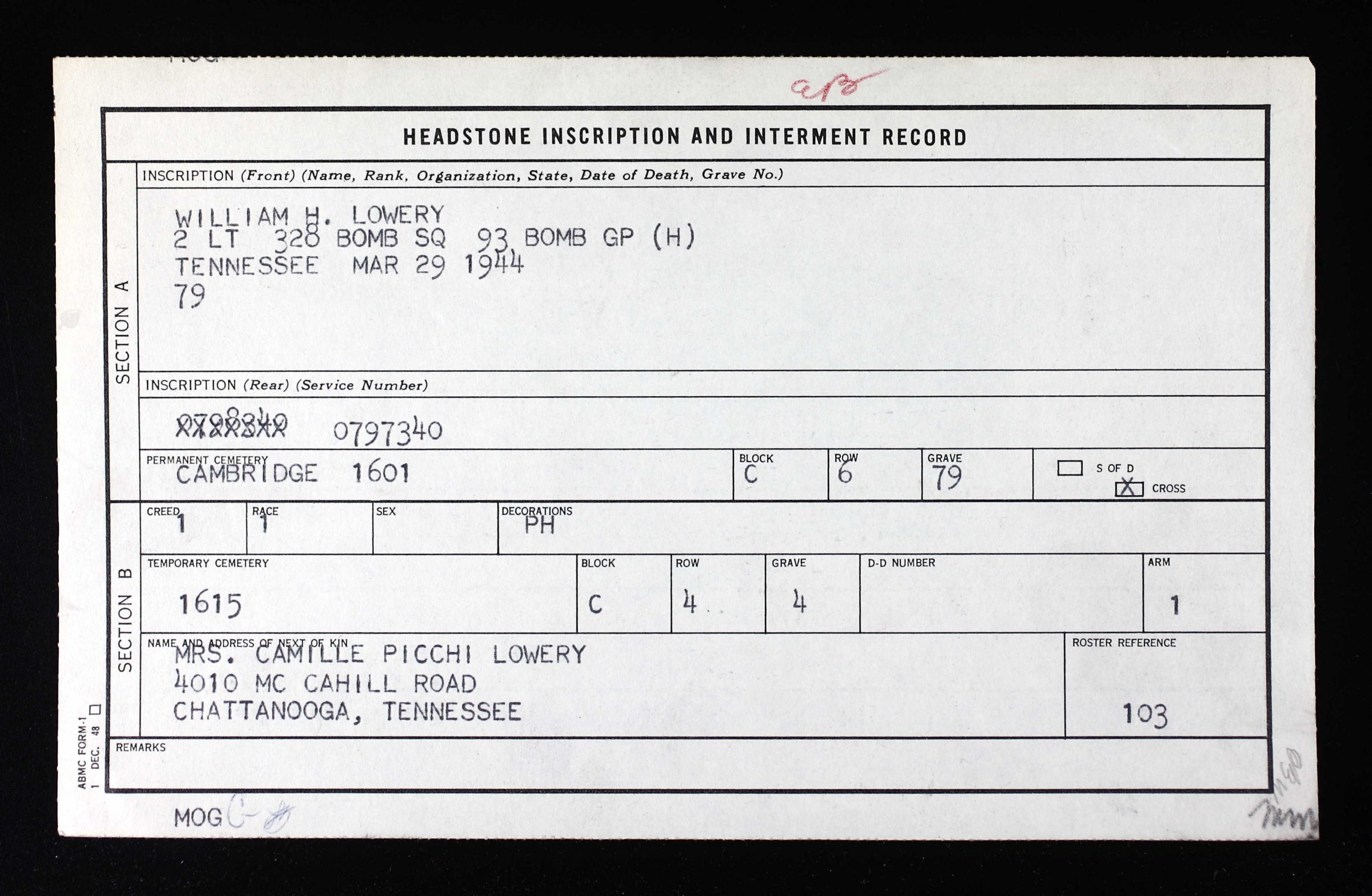 Second Lieutenant Lowery is buried at Cambridge American Cemetery, Cambridge, England, C, 6, 79.