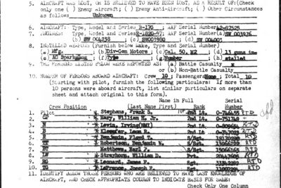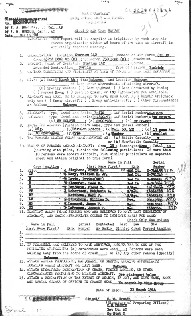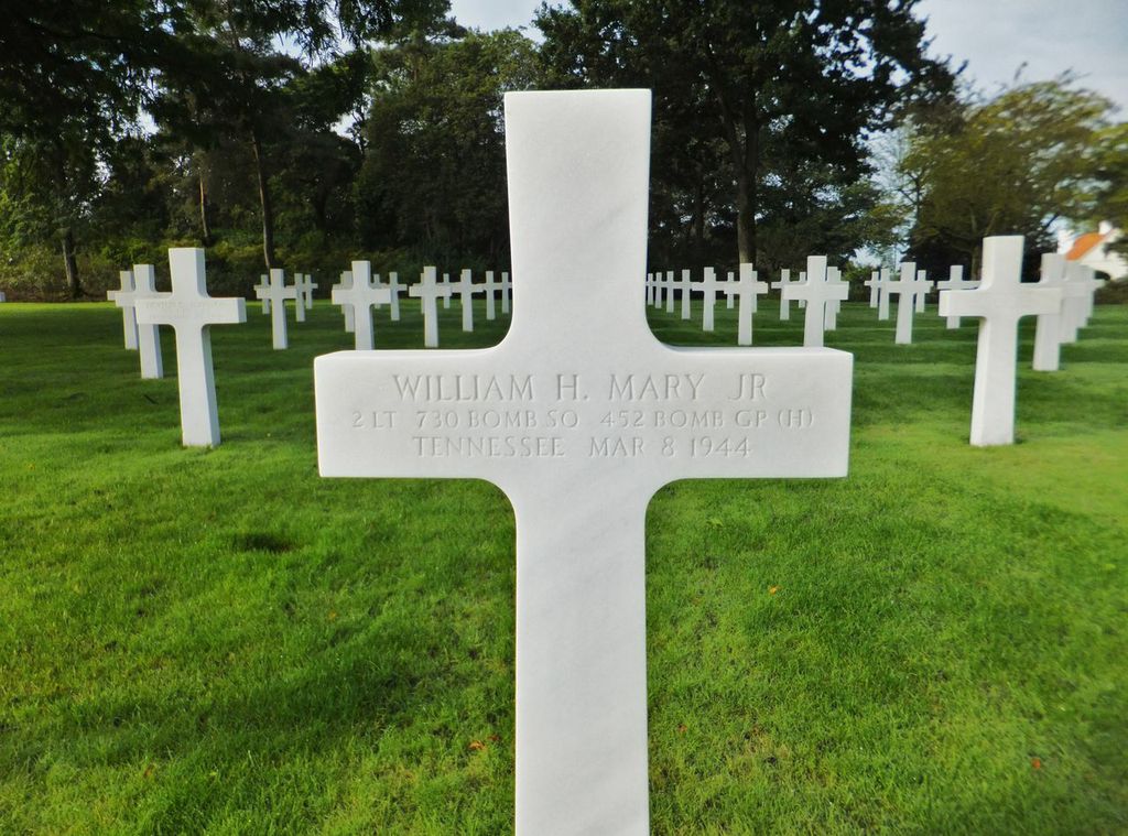 Aircraft B-17G with serial number 42-97525 was on a bombing mission to Berlin, Germany. The plane broke up in mid-air. The tail section broke off and the plane dived in, burning very heavy. The plane was observed to crash and burn with the bombs still in the plane. It crashed at Hebewerk Rothensee, 11km Northwest of Magdeburg, Germany. 2nd Lt Mary was last seen by the pilot, adjusting his chute when the plane broke up. He was initially buried 14 March at the Barleben Cemetery. All other crew members bailed out and were taken prisoner of war.