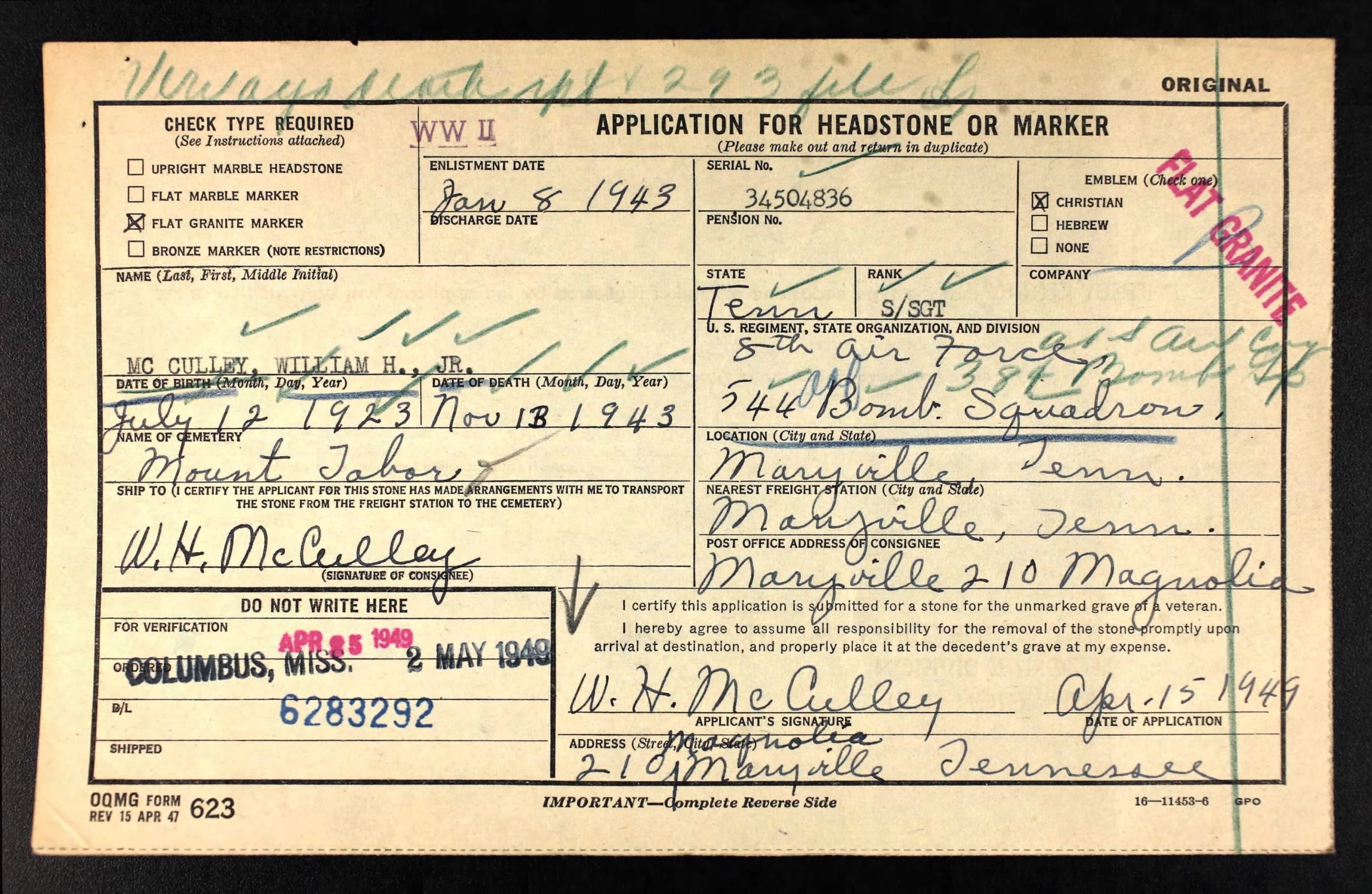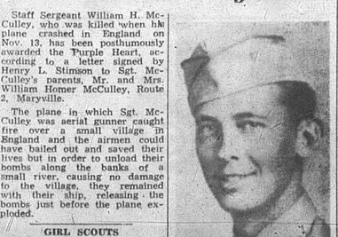 He enlisted in the Army Air Corps on January 9, 1943, in Fort Oglethorpe, GA. He served in the European Theater. He died on his first overseas mission on November 13, 1943. His heroic death was chronicled in the Maryville Enterprise on December 16, 1943. The article, titled “Sgt. McCulley Gives Life to Save Town”, reads, “Mr. and Mrs. Homer McCulley received a letter yesterday from a Lieutenant in the Army Air Corps giving details of the death of Staff Sergeant McCulley, He was on his first mission in Wargrave, Berkshire, England, in a B-17 Flying Fortress loaded with bombs. The plane caught fire over a city and couldn’t land on account of being loaded with bombs. If they had landed, the bombs would have wiped out the town. The crew got to a river and threw the bombs in. When the last bomb dropped, the plane exploded. All were killed but one boy. These nine boys gave their lives to save this town. The only survivor came down in his parachute.”