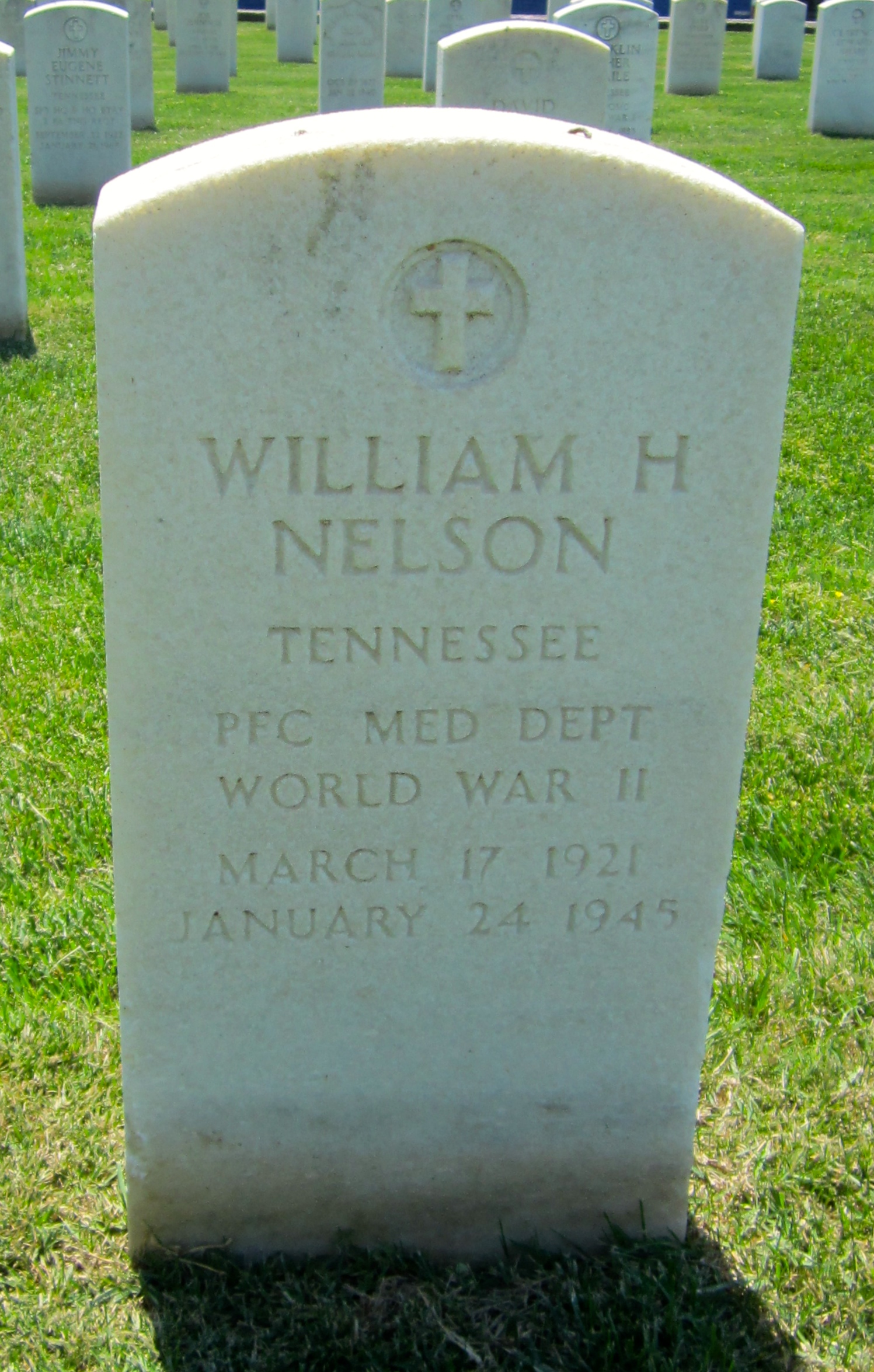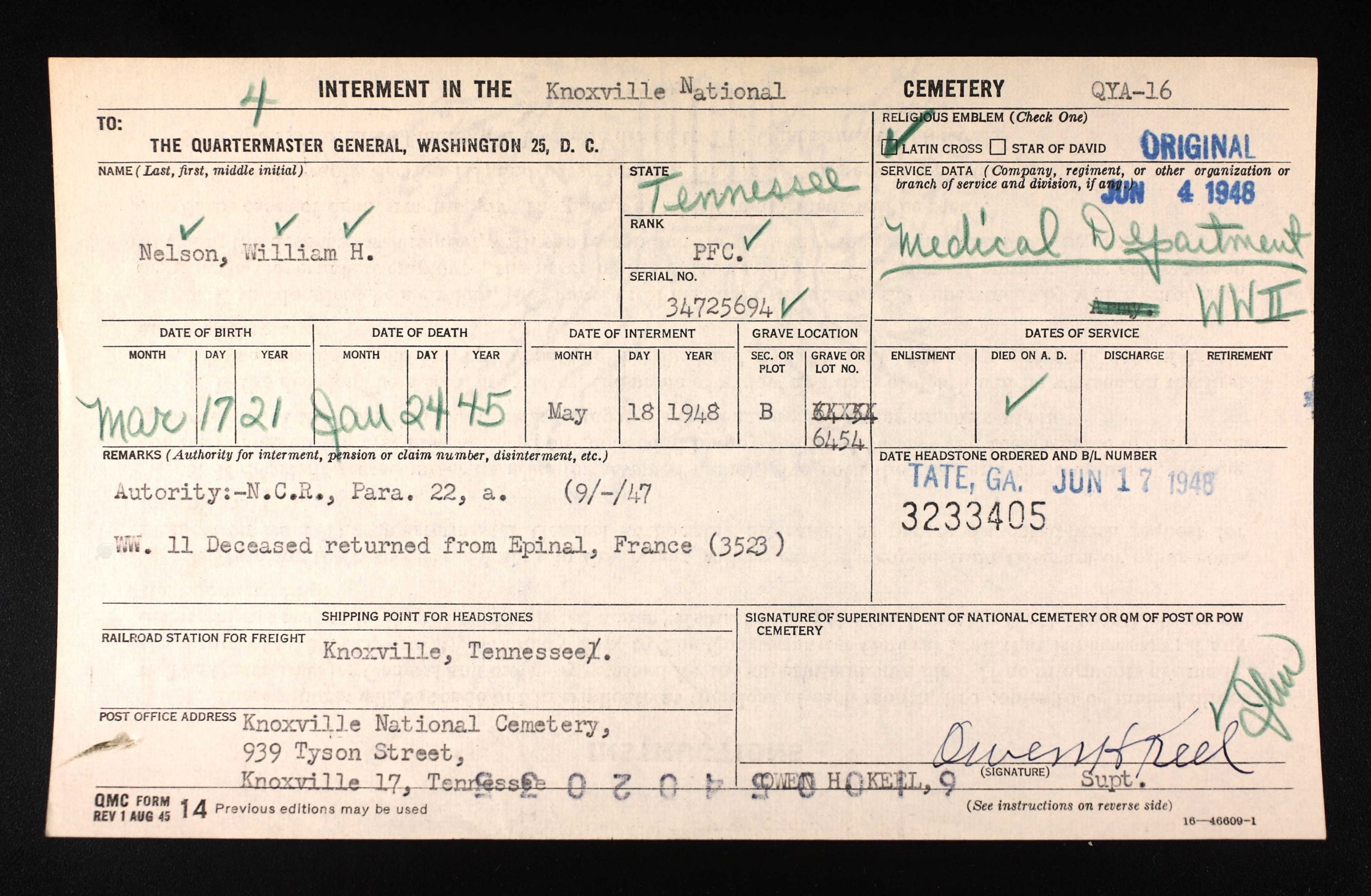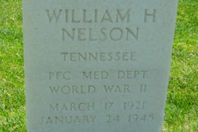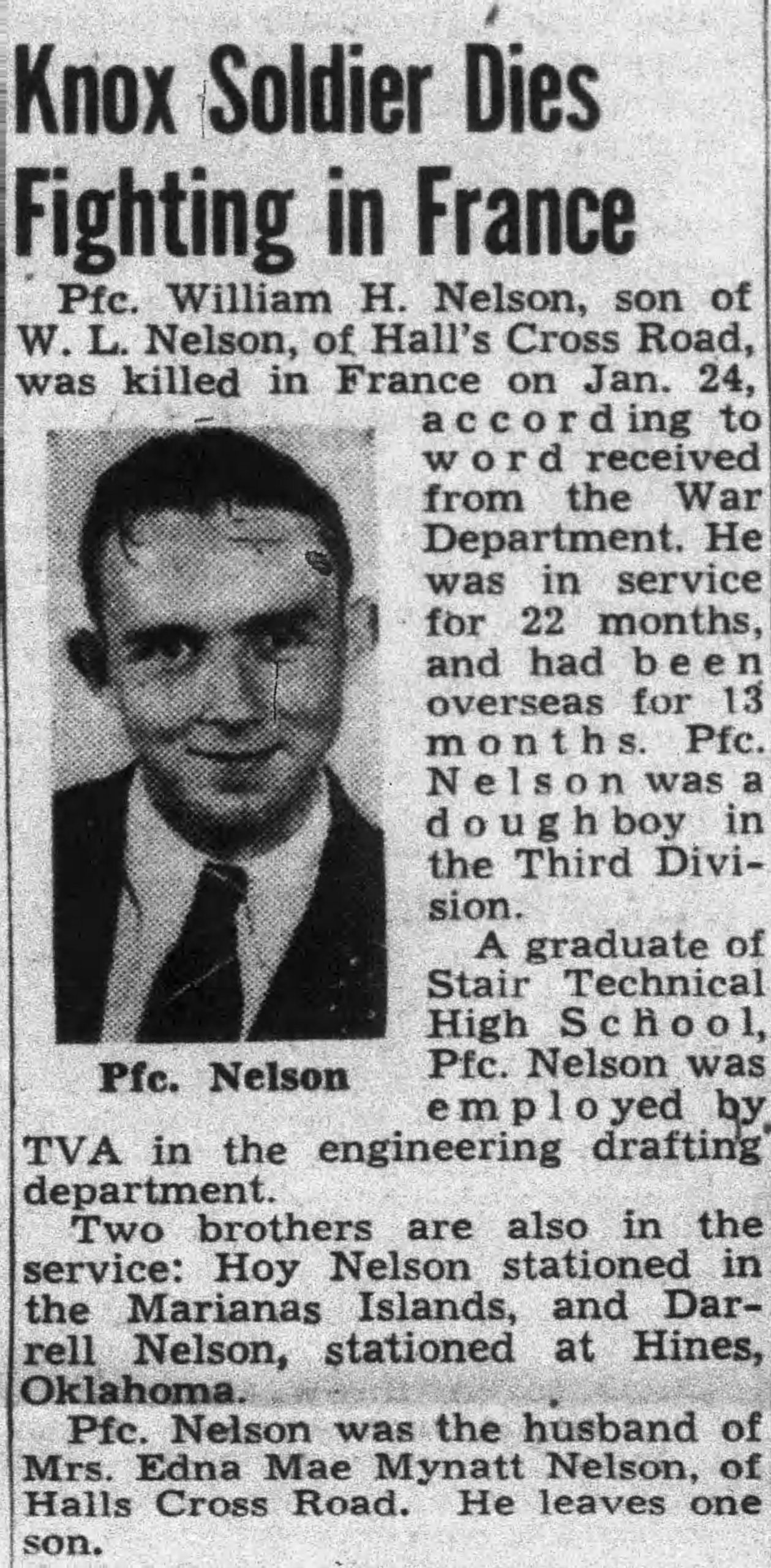 William Howard Nelson was born to William L. and Laura Nelson in Bryson City, NC, March 17, 1921, the eldest of seven children. Known as Harold to his family, he moved to Ducktown, TN, some time in the late 1920’s so that his father could work in the copper mines. Two of his brothers were born there. When the mines closed, the family moved to Knoxville. In January 1941 Harold married Edna Mae Mynatt of Knox Co. The previous December 1941 Harold’s only sister was killed in an accident. The following March 1942 a brother died from disease. In April 1942 Harold’s only child, Gary, was born. In 1943, and even though he had a wife and child, Harold wanted to do his part in defending his country from a terrible enemy. Harold joined the army while his brother, Hoyt, joined the navy. Two other brothers, Darrell and W.L. Jr., would follow later. After basic training at Camp Shelby, Mississippi, Harold was deployed to Europe and assigned to the 3rd Infantry Division, 2nd Battalion, Company F. On January 24, 1945, Harold was killed in action in the battle of the Colmar Pocket in eastern France. His brothers returned safely from the war. Harold is survived by his widow, Edna Mae Mynatt Nelson Taylor, his son, Gary E. Nelson, both of Knoxville, and a brother Hubert Nelson of Columbus, OH.