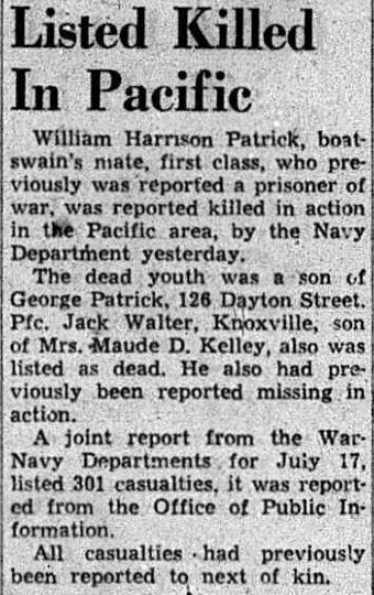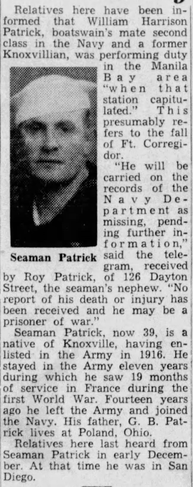 Relatives here have been informed that William Harrison Patrick, boatswain’s mate second class in the Navy and a former Knoxvillian, was performing duty in the Manila Bay area “when that station capitulated.” This presumably refers to the fall of Ft. Corregidor. “He will be carried on the records of the Navy Department as missing, pending further information,” said the telegram, received by Roy Patrick, of 126 Dayton Street, the seaman’s nephew.