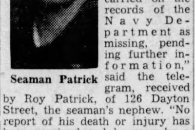 “No report of his death or injury has been received and he may be a prisoner of war.” Seaman Patrick, now 398, is a native of Knoxville, having enlisted in the Army in 1916. He stayed in the Army eleven years during which he saw 19 months of service in France during the first World War. Fourteen years ago he left the Army and joined the Navy. His father, G.B. Patrick lives at Poland, Ohio. Relatives here last heard from Seaman Patrick in early December. At that time he was in San Diego.