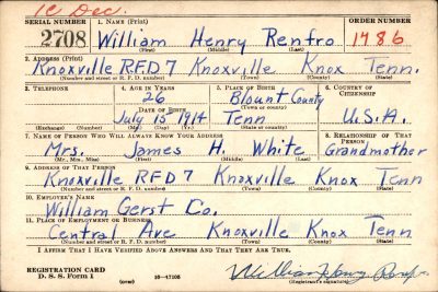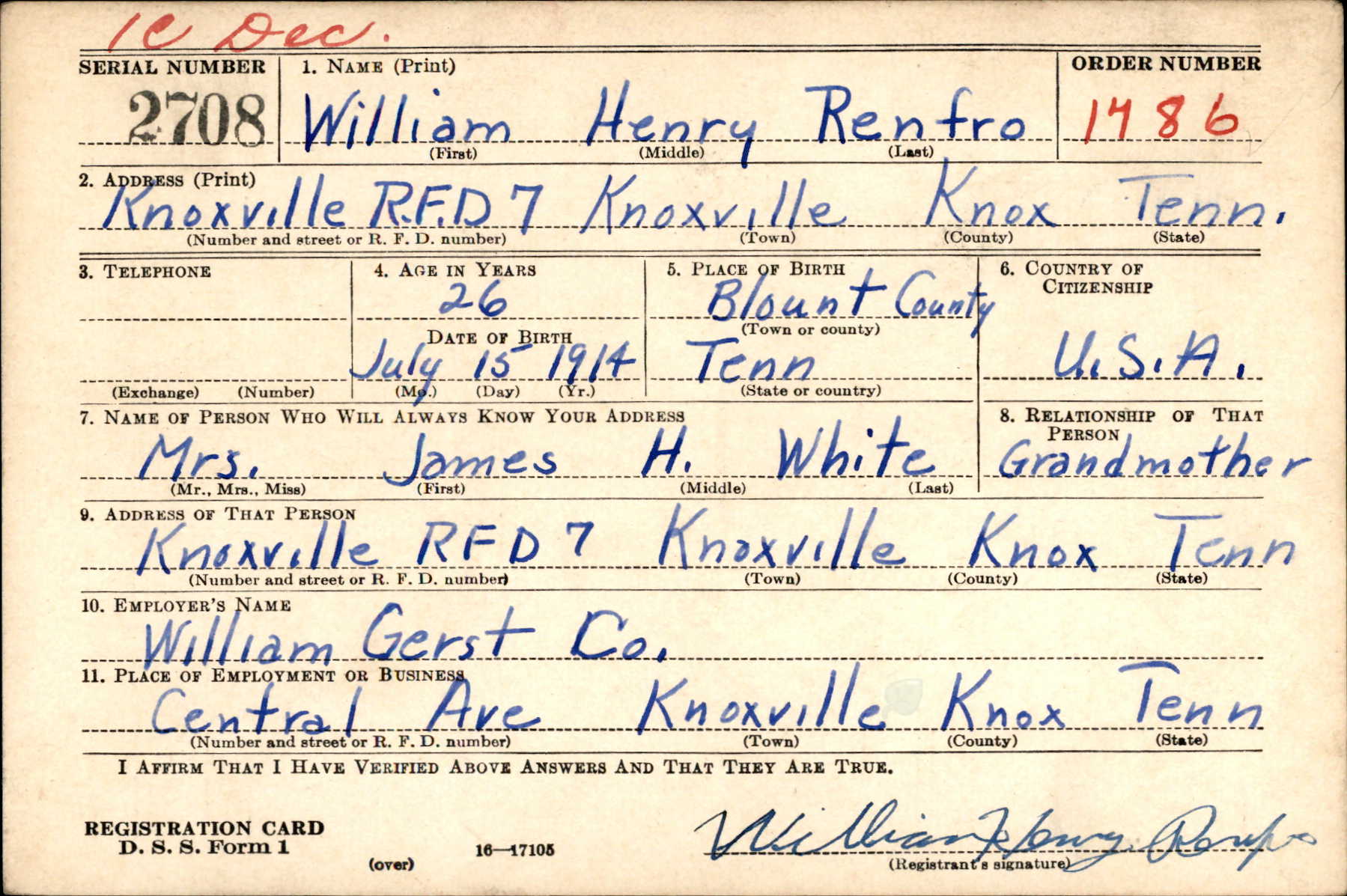 William Henry “Bill” Renfro was born on 15 July 1914 in Blount County, Tennessee. He was the son of Samuel Robert Renfro and Martha Ellen White. Brother of Carrie Edna Renfro, James Hubert Renfro, John Wilson Renfro and Clifford Clemens Renfro.