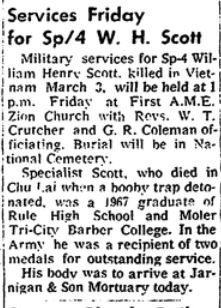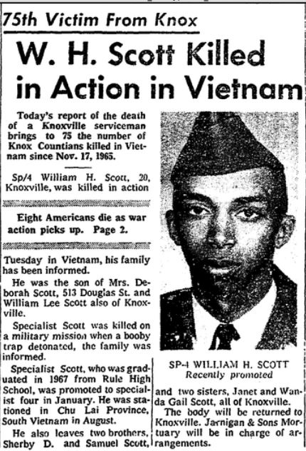 Sp./4 William H. Scott, 20, Knoxville, was killed in action Tuesday in Vietnam, his family has been informed. He was the son of Mrs. Deborah Scott, 513 Douglas St. and William Lee Scott also of Knoxville. Specialist Scott was killed on a military mission when a booby trap detonated, the family was informed. Specialist Scott, who was graduated in 1967 from Rule High School, was promoted to specialist four in January. He was stationed in Chu Lai Province, South Vietnam in August. He also leaves two brothers, Sherby D. and Samuel Scott, and two sisters, Janet and Wanda Gail Scott, all of Knoxville. The body will be returned to Knoxville. Jarnigan & Sons Mortuary will be in charge of arrangements.
