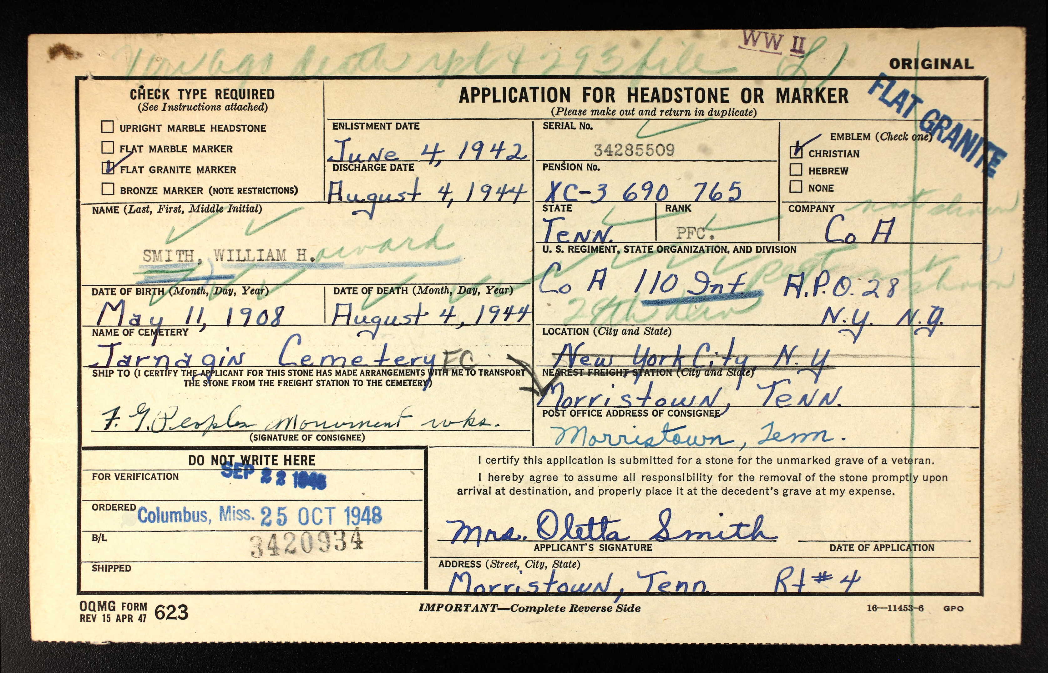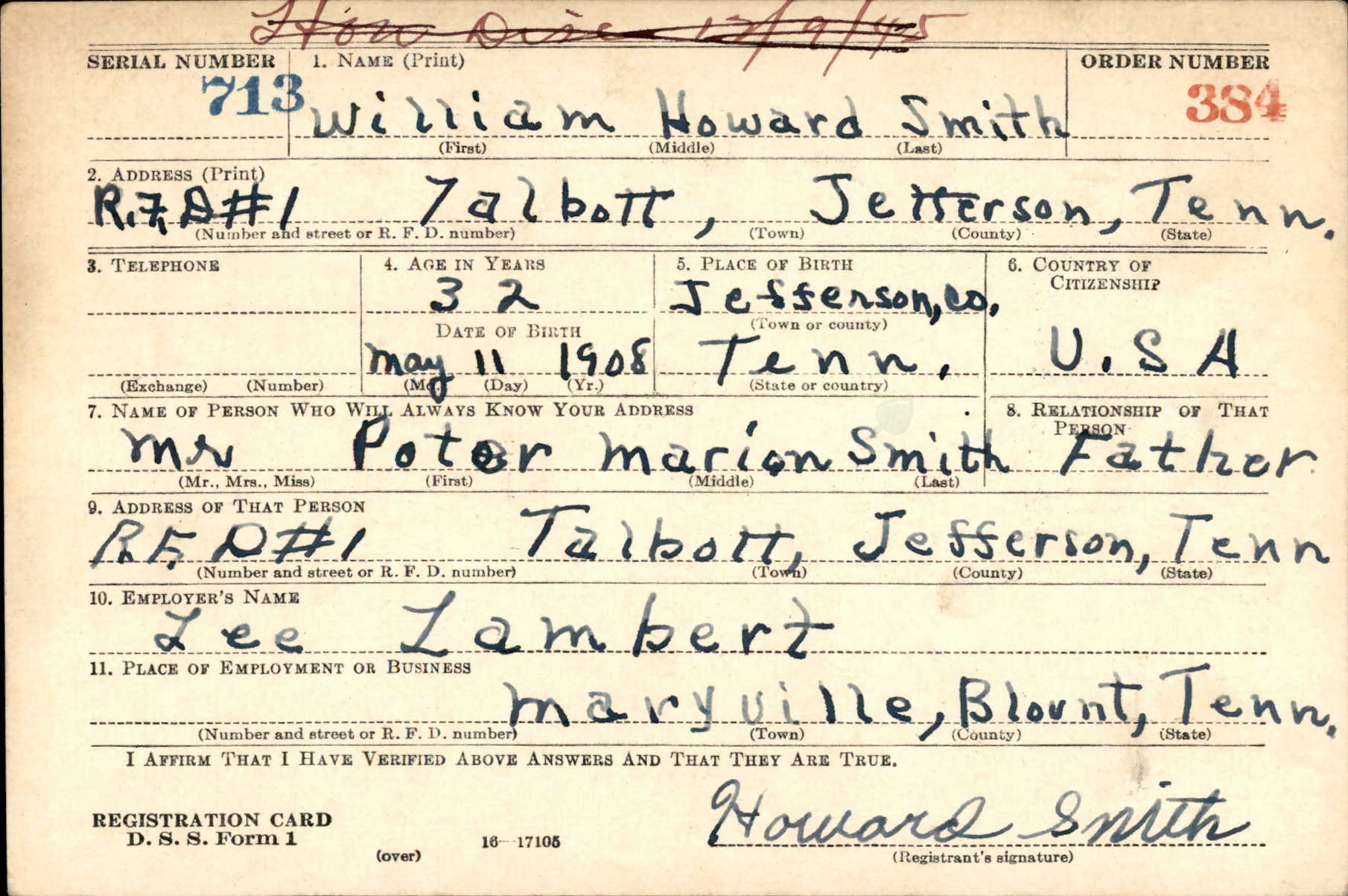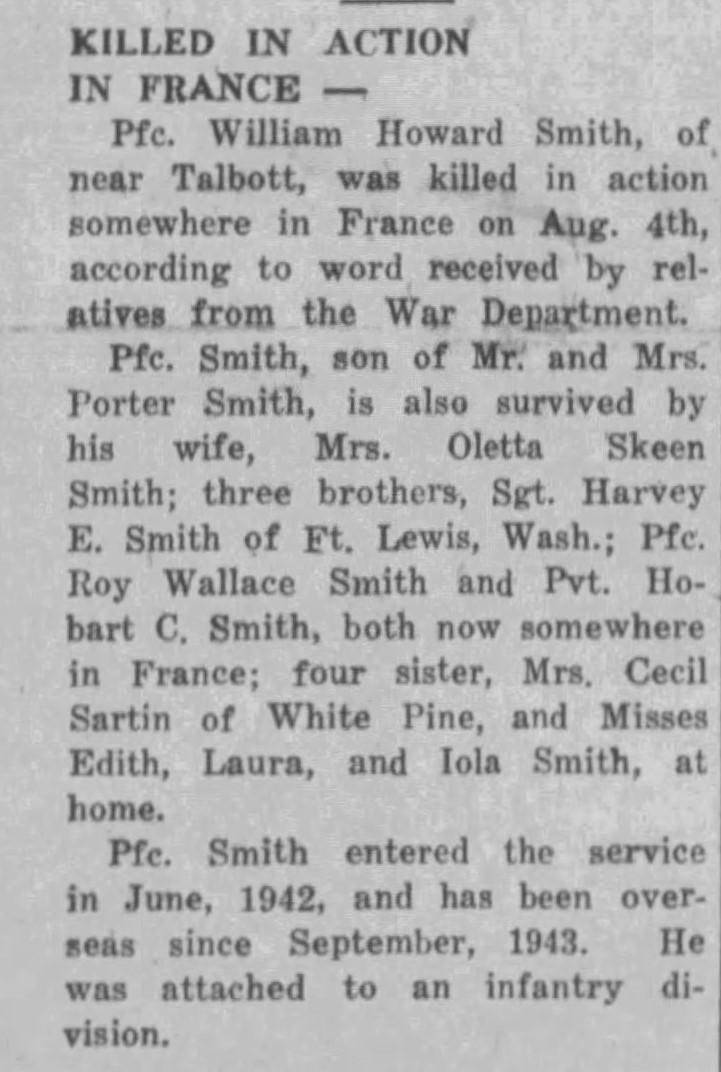 Pfc. William Howard Smith was killed in action in France, Aug. 4, according to a message from the War Department received by his wife, Mrs. Oletta Skeen Smith. Private Smith, attached to an infantry division, is the son of Mr. and Mrs. Porter Smith, Talbott. He entered service in June, 1942, and had been overseas since September, 1943. Three brothers are in service. They are Sgt. Harvey E. Smith, Washington, Pfc. Roy Wallace and Pvt. Hobert C. Smith, also in France. He also had four sisters, Mrs. Cecil Sartin of Whilte Pine, and Misses Edith, Laura, and Iola Smith, at home.