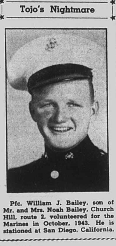 Pfc. William J. Bailey, son of Mr. and Mrs. Noah Bailey, Church Hill, route 2, volunteered for the Mraines in October, 1943. He is stationed at San Diego, California.