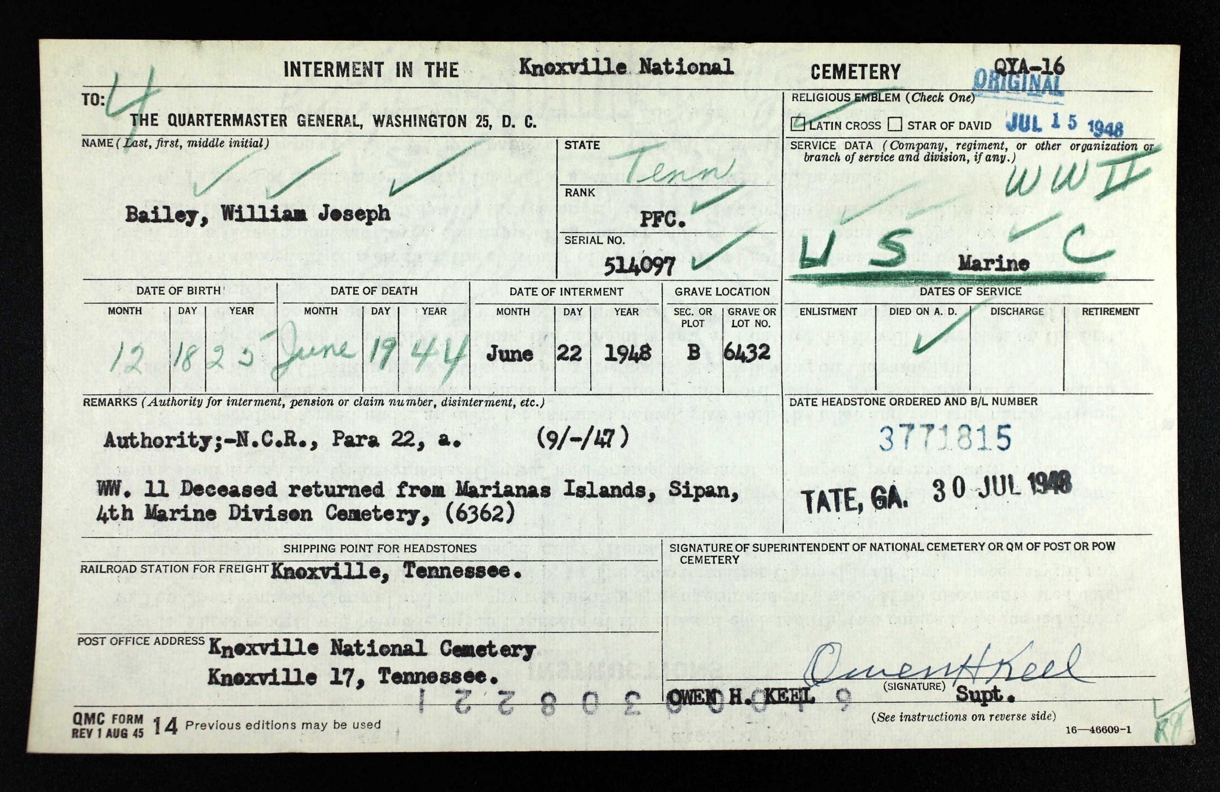 William Joseph Bailey was initially buried at Marianas Islands, Saipan, 4th Marine Division Cemetery.
