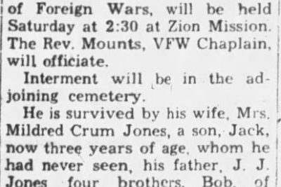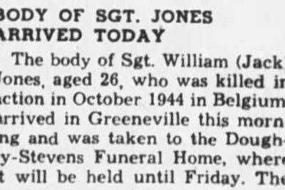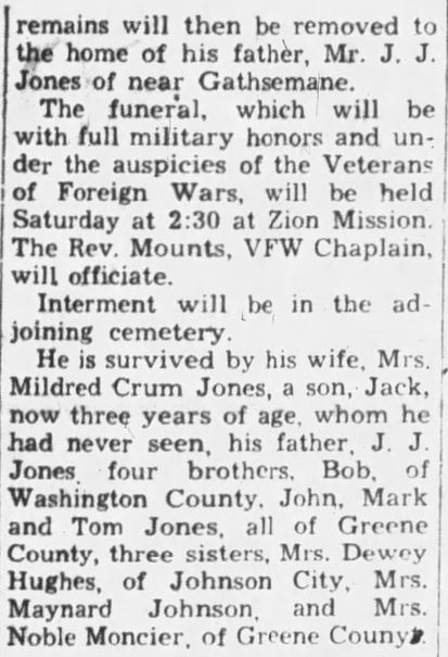 The body of Sgt. William (Jack) Jones, aged , who was killed in action in October 1944 in Belgium, arrived in Greeneville this morning and was taken to the Doughty-Stevens Funeral Home, where it will be held until Friday. The remains will then be removed to the home of his father, Mr. J.J. Jones of near Gathsemane. The funeral, which will be with full military honors and under the auspicies of the Veterans of Foreign Wars, will be held at Zion Mission. Interment will be in the adjoining cemetery. He is survived by his wife, Mrs. Mildred Crum Jones, a son, Jack, now three years of age, whom he had never seen, his father, J.J. Jones, four brothers, Bob, of Washington County, John, Mark and Tom Jones, all of Greene County, three sisters, Mrs. Dewey Hughes, of Johnson City, Mrs. Maynard Johnson, and Mrs. Noble Moncier, of Greene County.