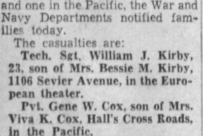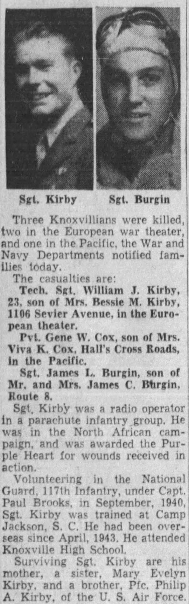Sgt. Kirby was a radio operator in a parachute infantry group. He was in the North African campaign, and was awarded the Purple Heart for wounds received in action. Volunteering in the National Guard, 117th Infantry, under Capt. Paul Brooks, in September, 1940, Sgt. Kirby was trained at Camp Jackson, S.C. He had been overseas since April, 1943. He attended Knoxville High School. Surviving are his mother, a sister, Mary Evelyn Kirby and a brother, Pfc. Philip A. Kirby, of the U.S. Air Force.