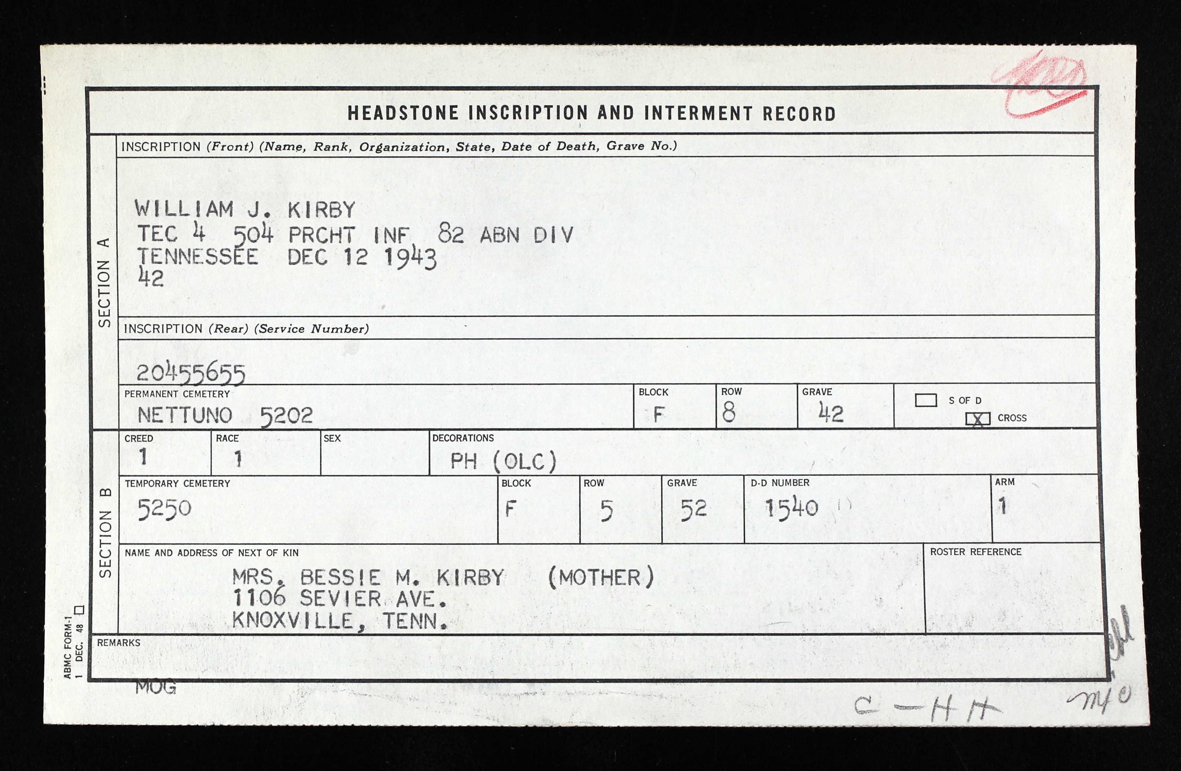 William James Kirby was the son of Austin Isaac Kirby and Bessie Madeline Faulkner. Brother of Phillip Austin Kirby and Mary Elizabeth Kirby. He Enlisted on September 16, 1940, in Knoxville, TN and servedwith the U.S. Army, 504th Parachute Infantry Regiment, 82nd Airborne Division