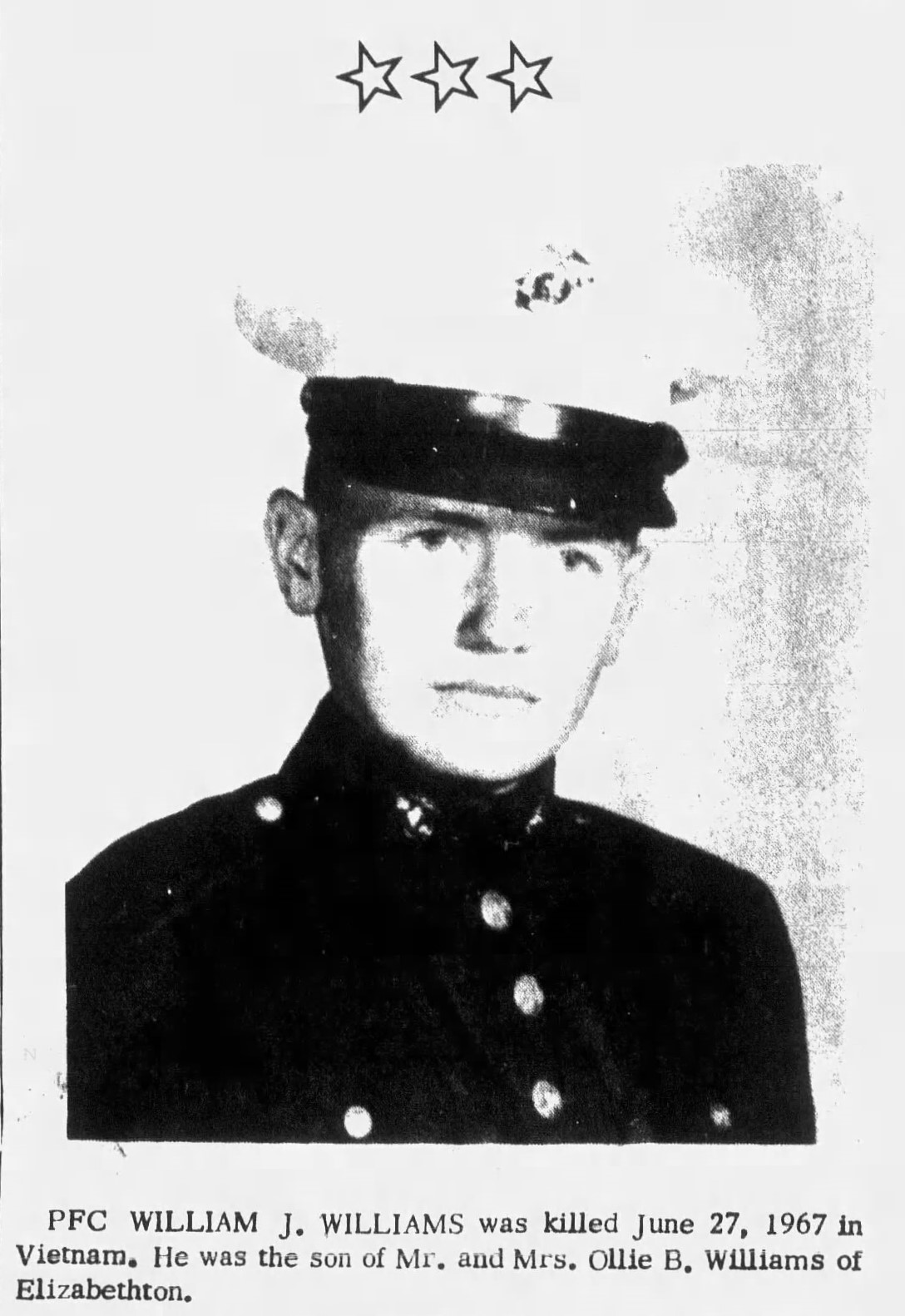 Private First Class William Jack Williams was born on January 24, 1946, and was originally from Elizabethton, Tennessee. He served his country in the Vietnam War in the United States Marine Corps, as a rifleman in L Company, 3rd Battalion, 26th Marines, 3rd Marine Division. On June 27, 1967, PFC Williams was part of a combined force with I Company, 3rd Battalion attempting to rescue other ambushed Marines in Quang Tri province, South Vietnam; he was killed in the ensuing firefight, along with 18 of his fellow soldiers, at the age of 21. PFC Williams is memorialized on the Vietnam Veterans Memorial on Panel 22E, Line 75.