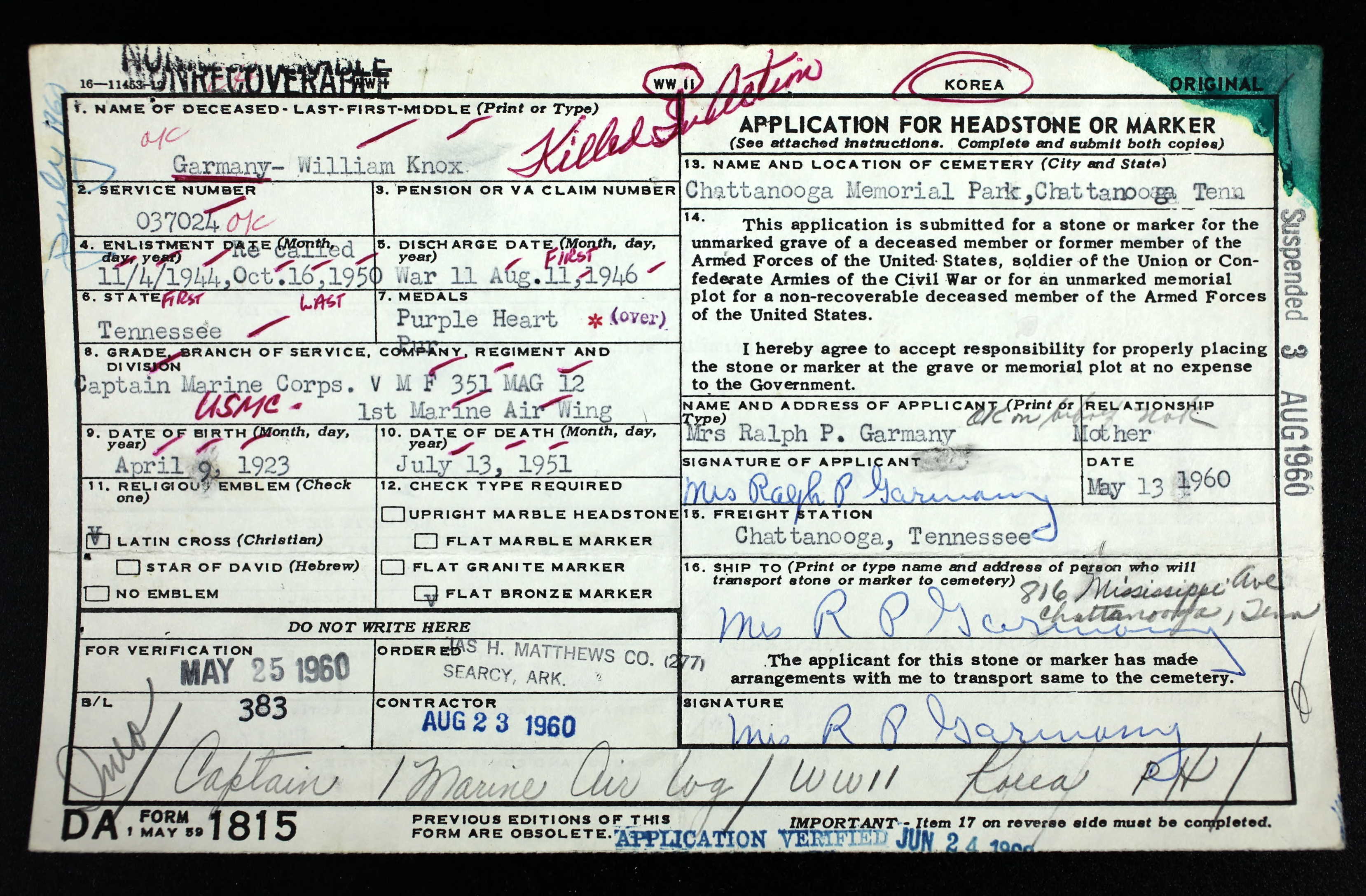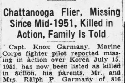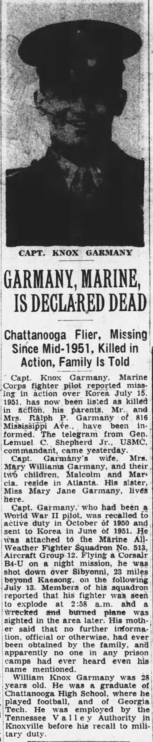 Capt. Knox Garmany, Marine Corps fighter pilot reported missing in action in Korea July 15, 1951, has now been listed as killed in action, his parents, Mr. and Mrs. Ralph P. Garmany of 816 Mississippi Ave., have been informed. The telegram from Gen. Lemuel C. Shepherd Jr., USMC, commandant, came yesterday. Capt. Garmany’s wife, Mrs. Mary Williams Garmany, and their two children, Malcolm and Marcia, reside in Atlanta. His sister, Miss Mary Jane Garmany, lives here. Capt. Garmany, who had been a World War II pilot, was recalled to active duty in October of 1950 and sent to Korea in June of 1951. He was attached to the Marine All-Weather Fighter Squadron No. 513, Aircraft Group 12. Flying a Corsair B4-U on a night mission, he was shot down over Sibyonni, 23 miles beyond Kaesong, on the following July 13. Members of his squadron reported that his fighter was seen to explode at 2:58 a.m. and a wrecked and burned plane was sighted in the area later. His mother said that no further information, official or otherwise, had ever been obtained by the family, and apparently no one in any prison camps had ever heard even his name mentioned. William Knox Garmany was 28 years old. He was a graduate of Chattanooga High School where he played football, and of Georgia Tech. He was employed by the Tennessee Valley Authority in Knoxville before his recall to Military duty.
