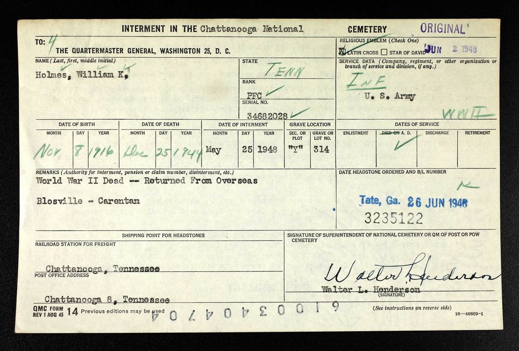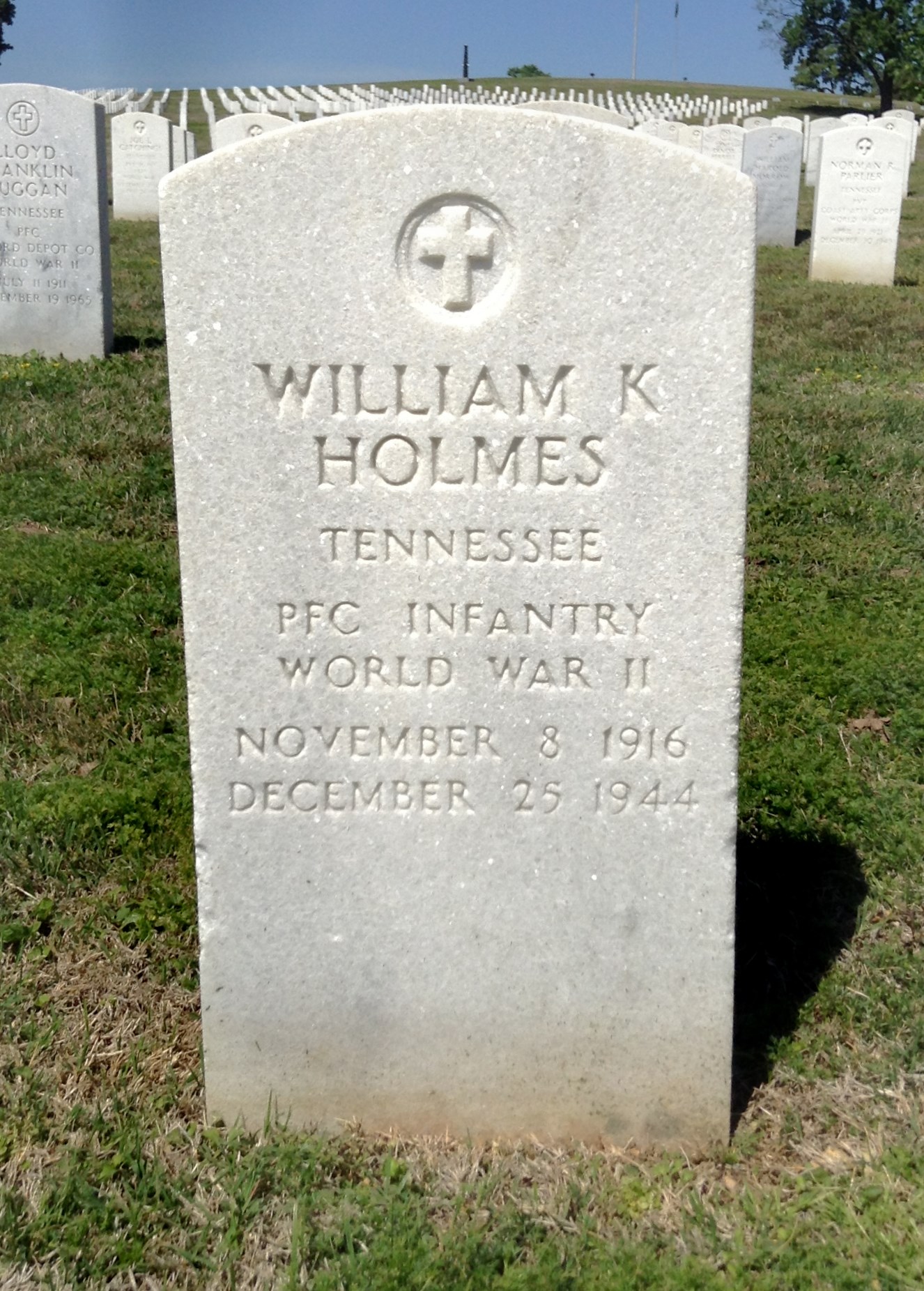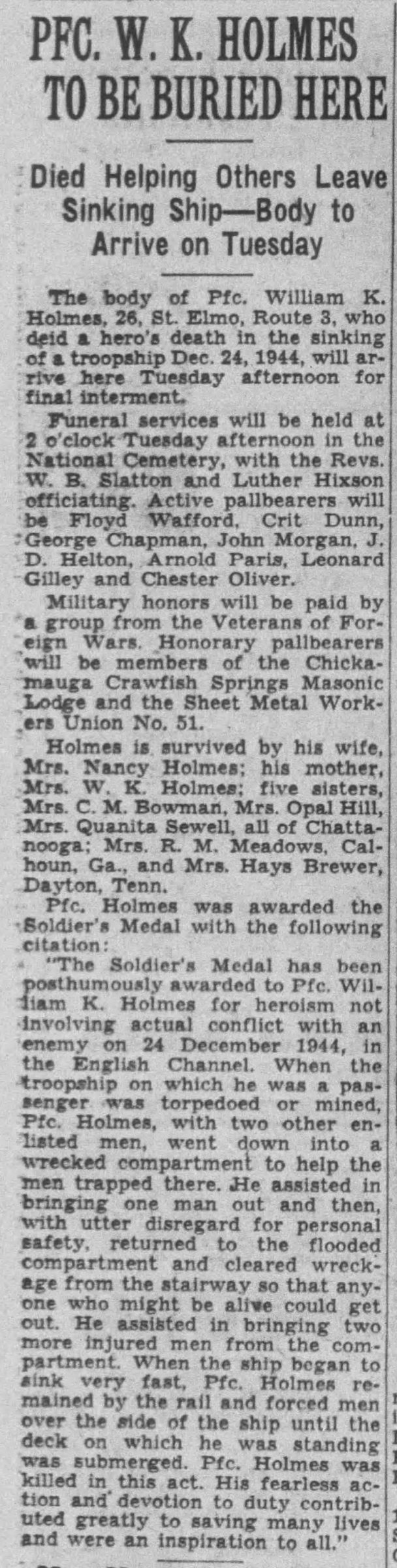 Pfc. William Keith Holmes, 28, husband of the former Miss Nancy Johnson of Flintstone, Ga., and the son of Mrs. W.K. Holmes Sr. of East 18th Street was killed in action in the European theater on December 25. Pfc. Holmes entered the service in December, 1942 and served with the military police detachment at Fort Benning, Ga., until last summer, when he was transferred to the infantry. He went overseas last November. Before entering the army he was employed at the Volunteer Ordnance Works here. He was the brother of Mrs. Martha Stanfield, Mrs. W.M. Hill, Mrs. F.H. Sewell, all of Chattanooga, and of Mrs. R.M. Meadows of Shannon, Ga., and Mrs. Hayes Brewer, Dayton, Tenn.