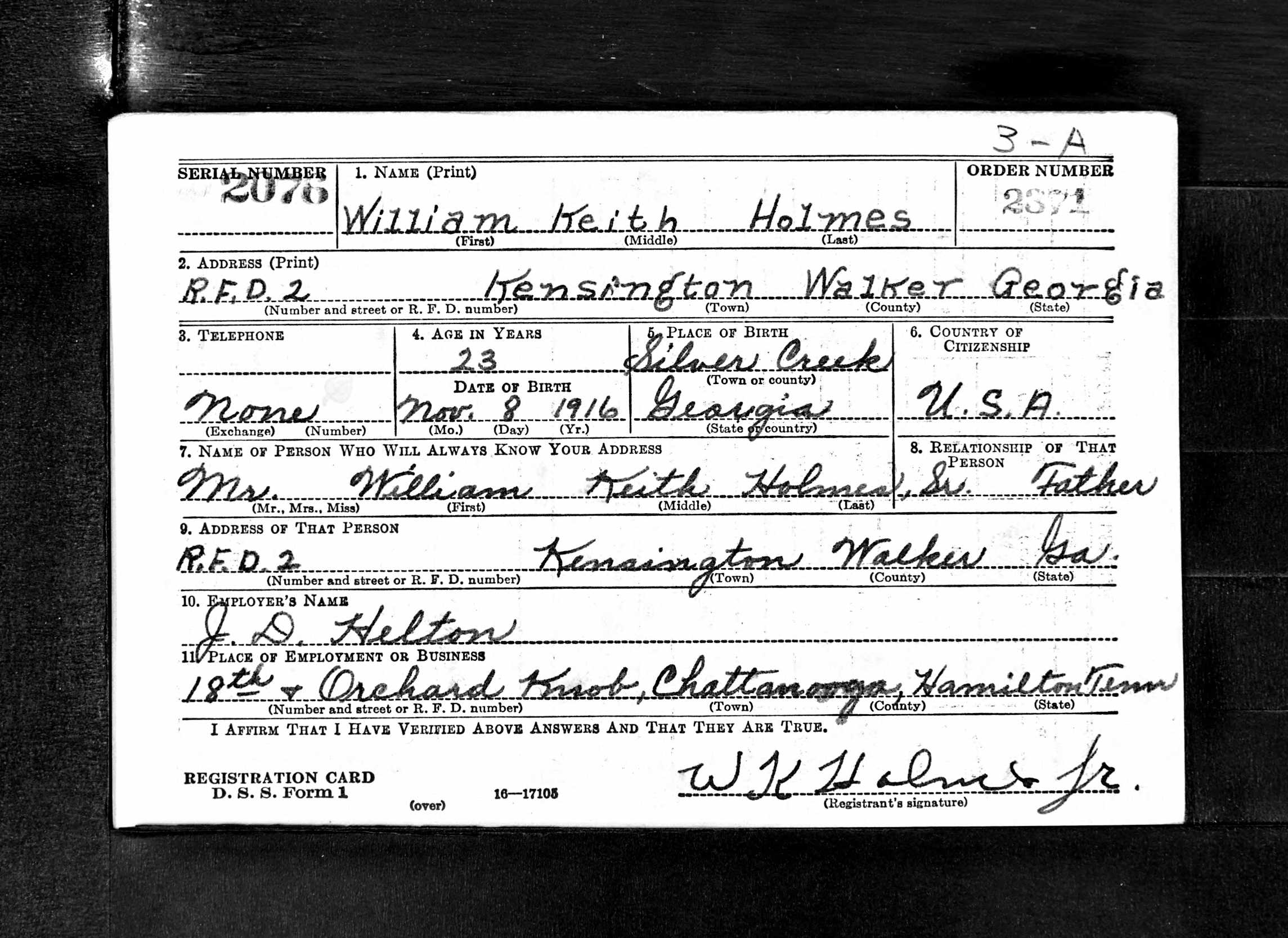 William Keith Holmes was born in Georgia to William Keith Holmes and Myrtle Agate Kerr. He was married with Nancy Pearl Johnson.