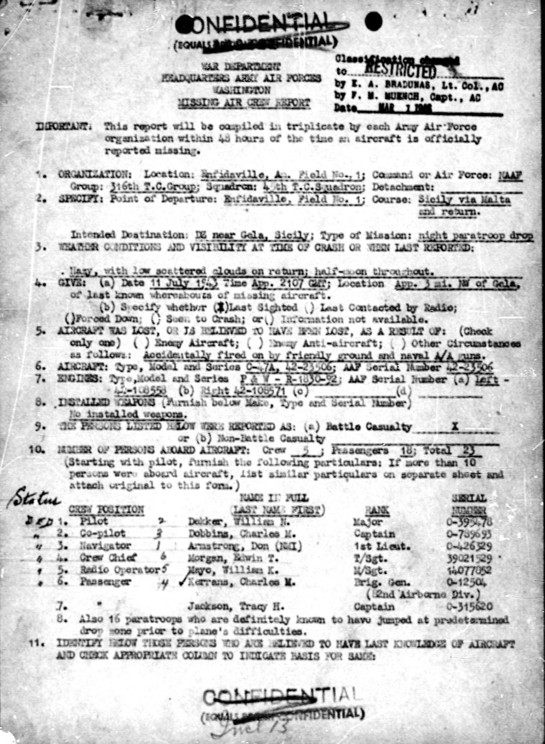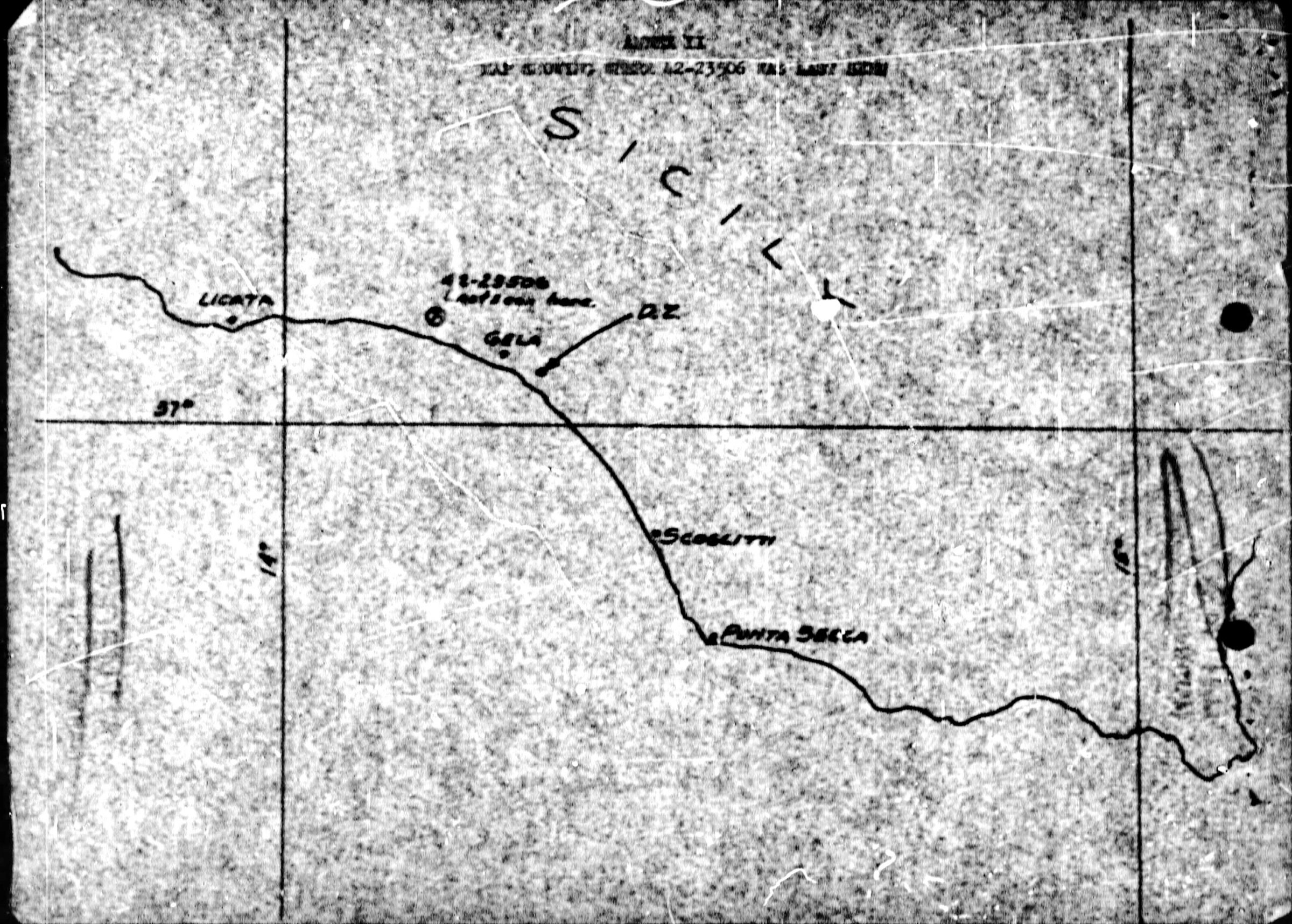 I last saw 506 piloted by Major Dekker and Captain Dobbins heading along the coast northeast from Gela, just off shore. At this time (approximately 2113 GMT) the plane flew through a barrage of anti-aircraft fire, both from the ground and from naval vessels, at which time I lost sight of it and proceeded home. The guns are believed to be friendly because they were located at points known to be in our possession, and also because in some cases they ceased firing when the recognition signal was flashed.