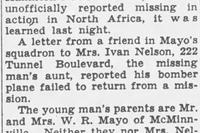 The young man’s parents are Mr. and Mrs. W.R. Mayo of McMinnville. Neither they nor Mrs. Nelson has received any word from the War Department reporting Mayo to be missing.