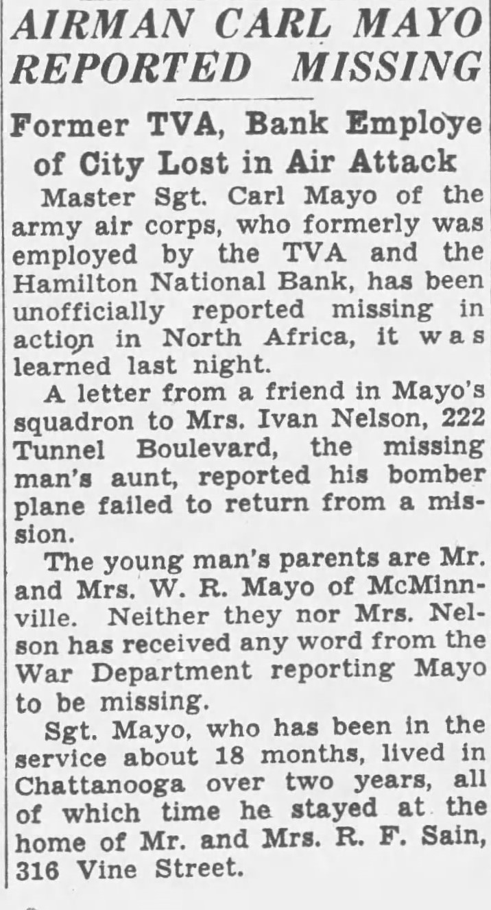 Master Sgt. Carl Mayo of the army air corps, who formerly was employed by the TVA and the Hamilton National Bank, has been unofficially reported missing in action in North Africa, it was learned last night. A letter from a friend in Mayo’s squadron to Mrs. Ivan Nelson, 222 Tunnel Boulevard, the missing man’s aunt, reported his bomber plane failed to return from a mission.