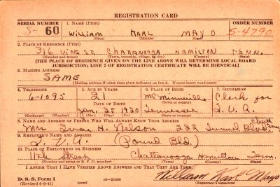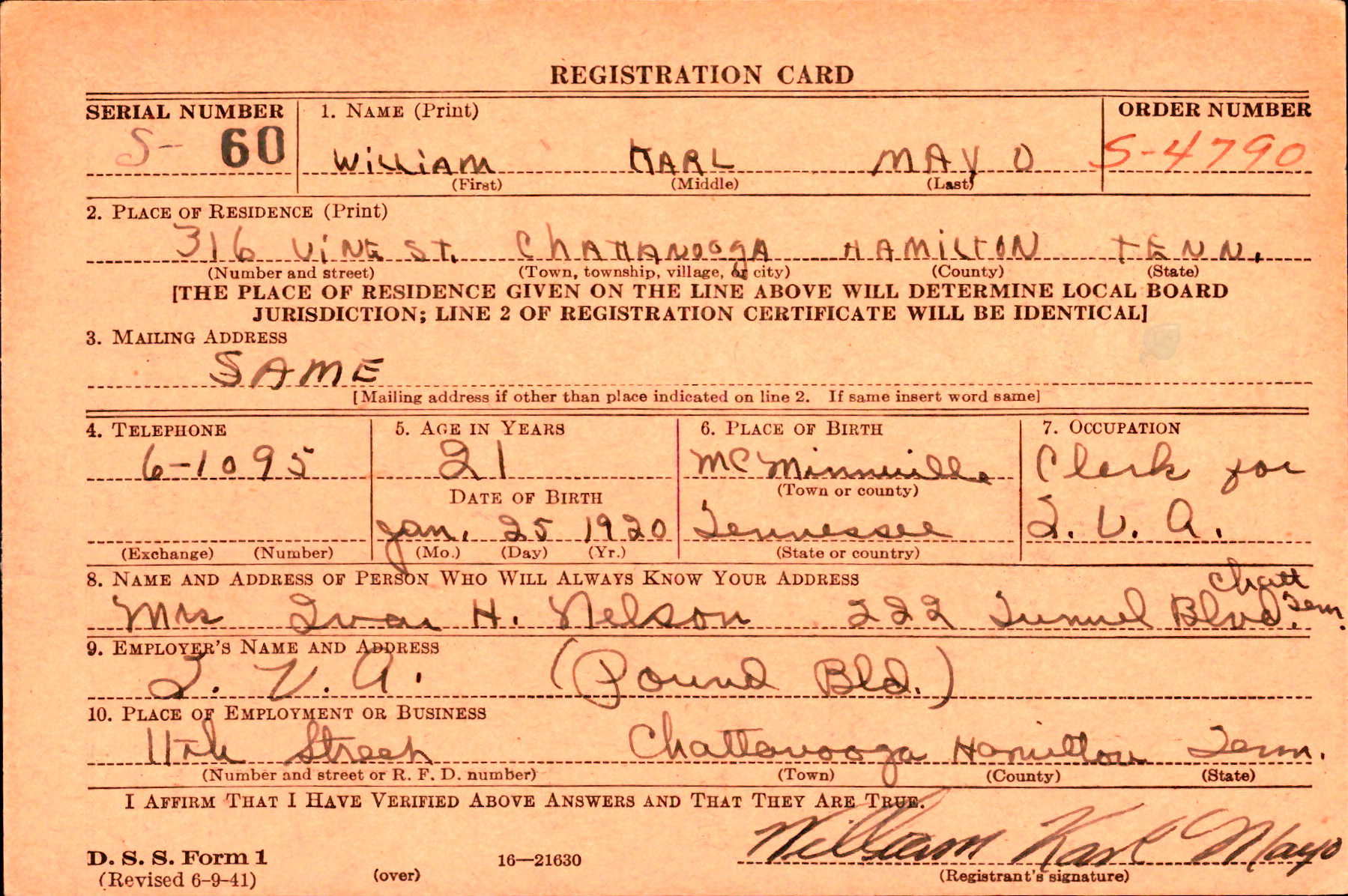 William Karl Mayo was born in McMinnville, Tennessee to William Ross Mayo and Adele Carver.