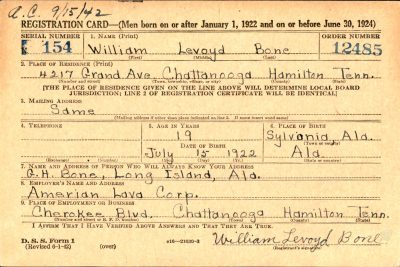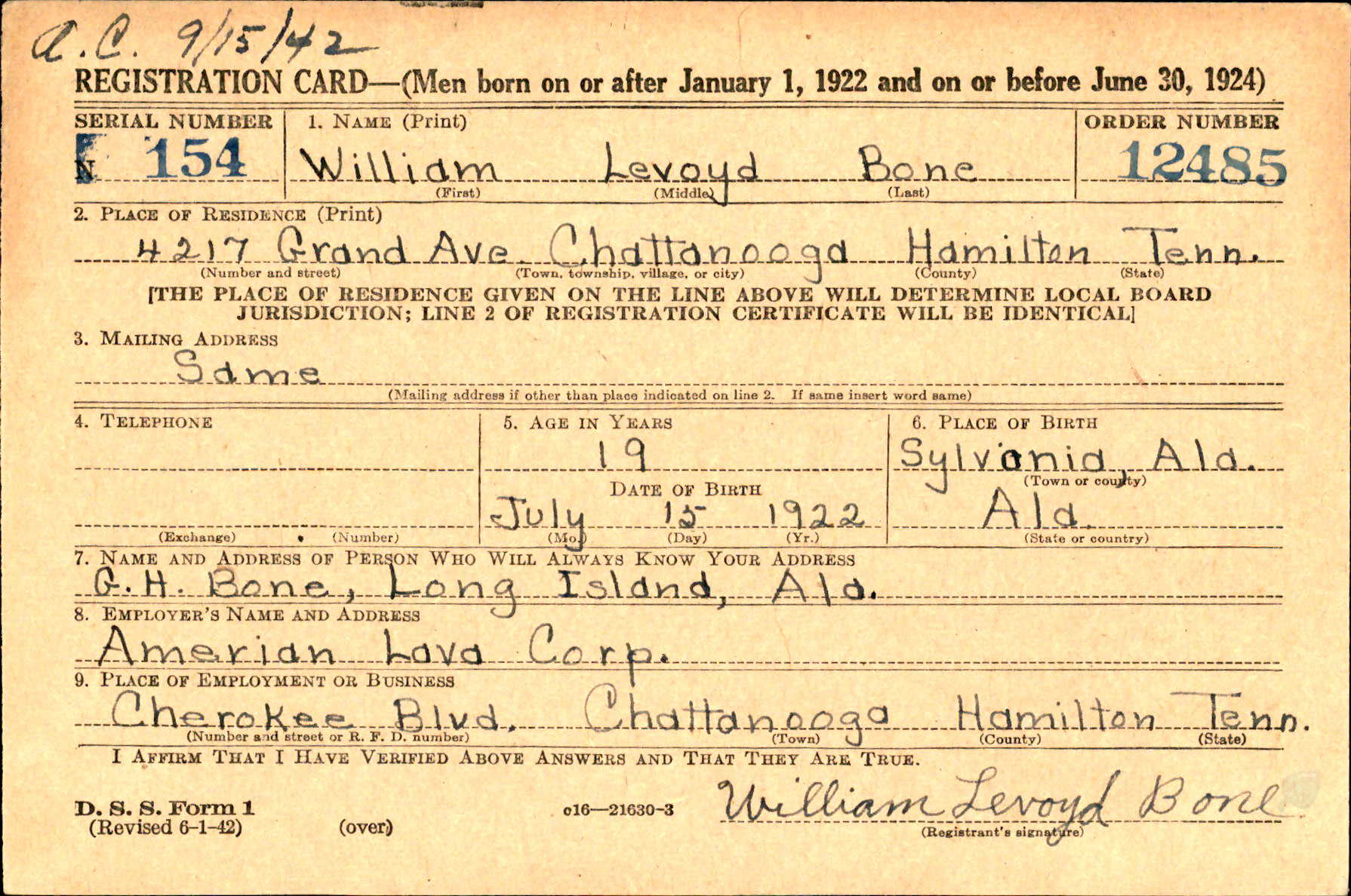William Levoyd Bone was born in Alabama to George Homer Bone and Theodocia Armanda Stone.