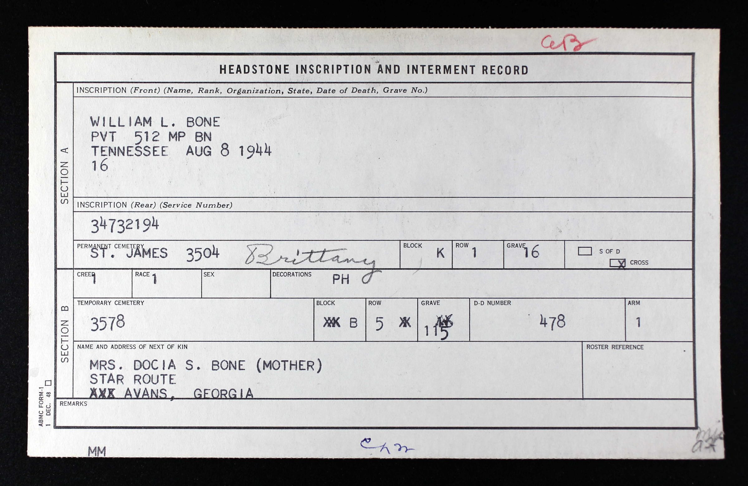 Private William L. Bone was assigned to the 512th Military Police Battalion, which was involved in the Normandy campaign. He died on 8 August 1944 and is interred at K,1,16, Brittany American Cemetery, St James, France.