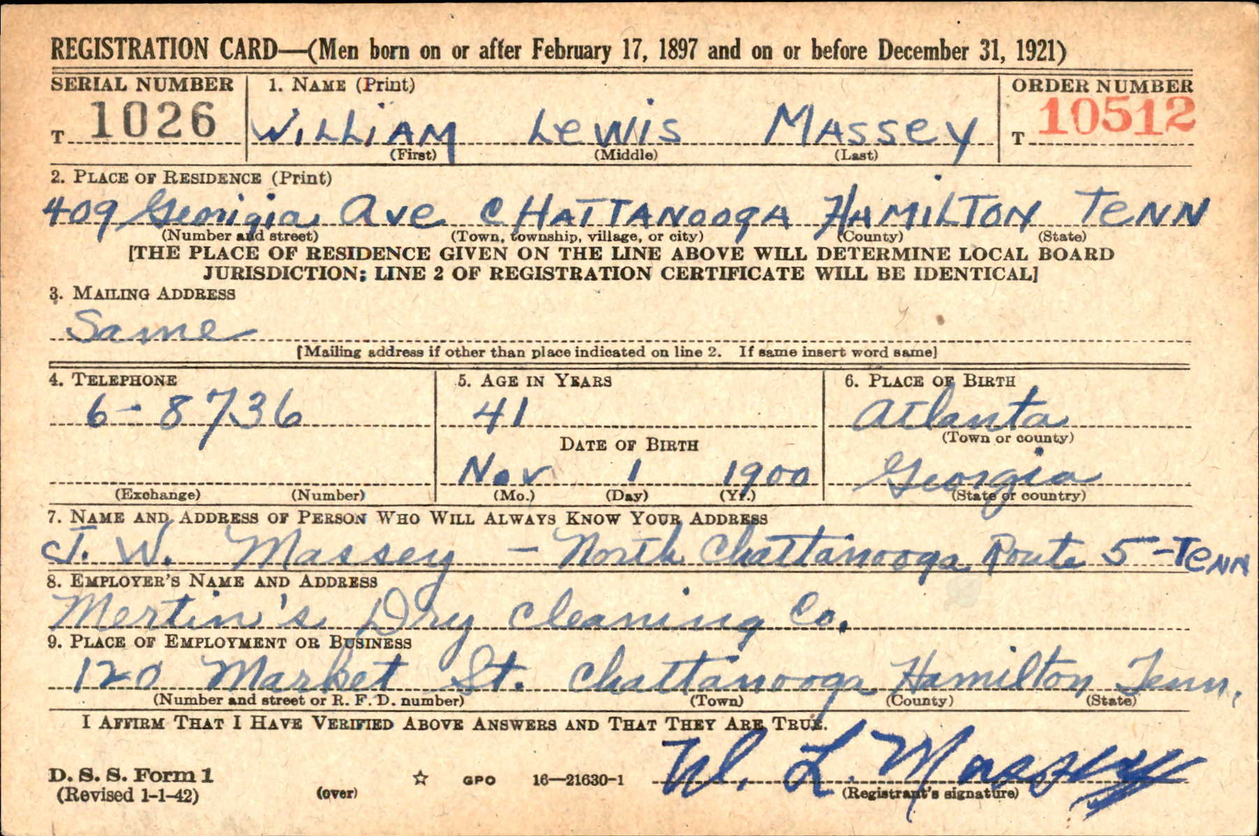 William Lewis Massey was the first son, third child of James William Massey, a well known Chattanooga contractor, and his first wife Hattie J. Sabrina Creighton. Born November 1, 1900 in Atlanta, Fulton County GA, he spent most of his years in Chattanooga, Tennessee which he considered his home. It was there that he and his brother Ernest and half-brother John Allen [Bud], and his sisters Lucy, Kate and half-sister Frances went to school and Northside Baptist Church.