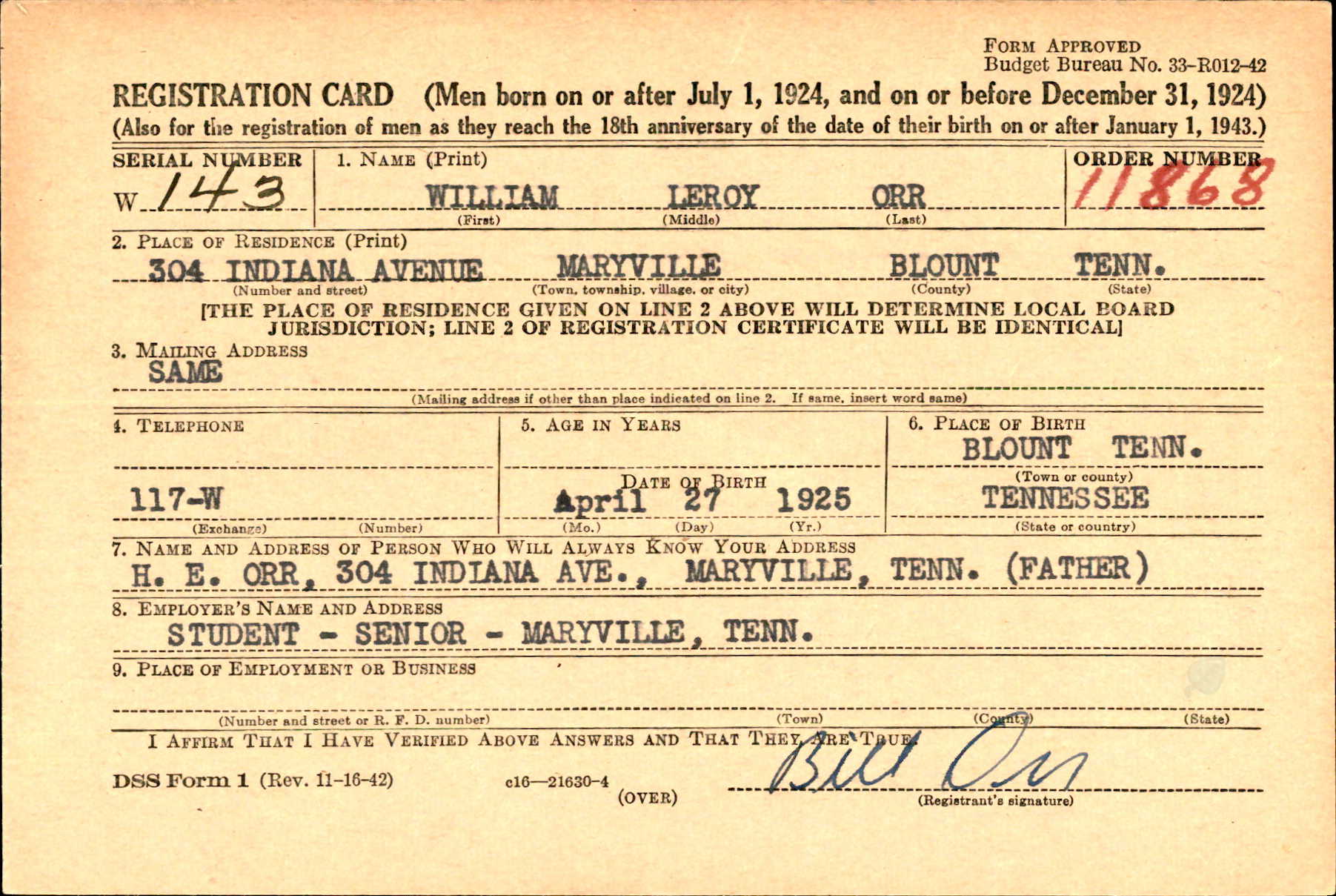 William Leroy “Bill” Orr was the son of Horace Eugene Orr and Loy McCord Alexander.