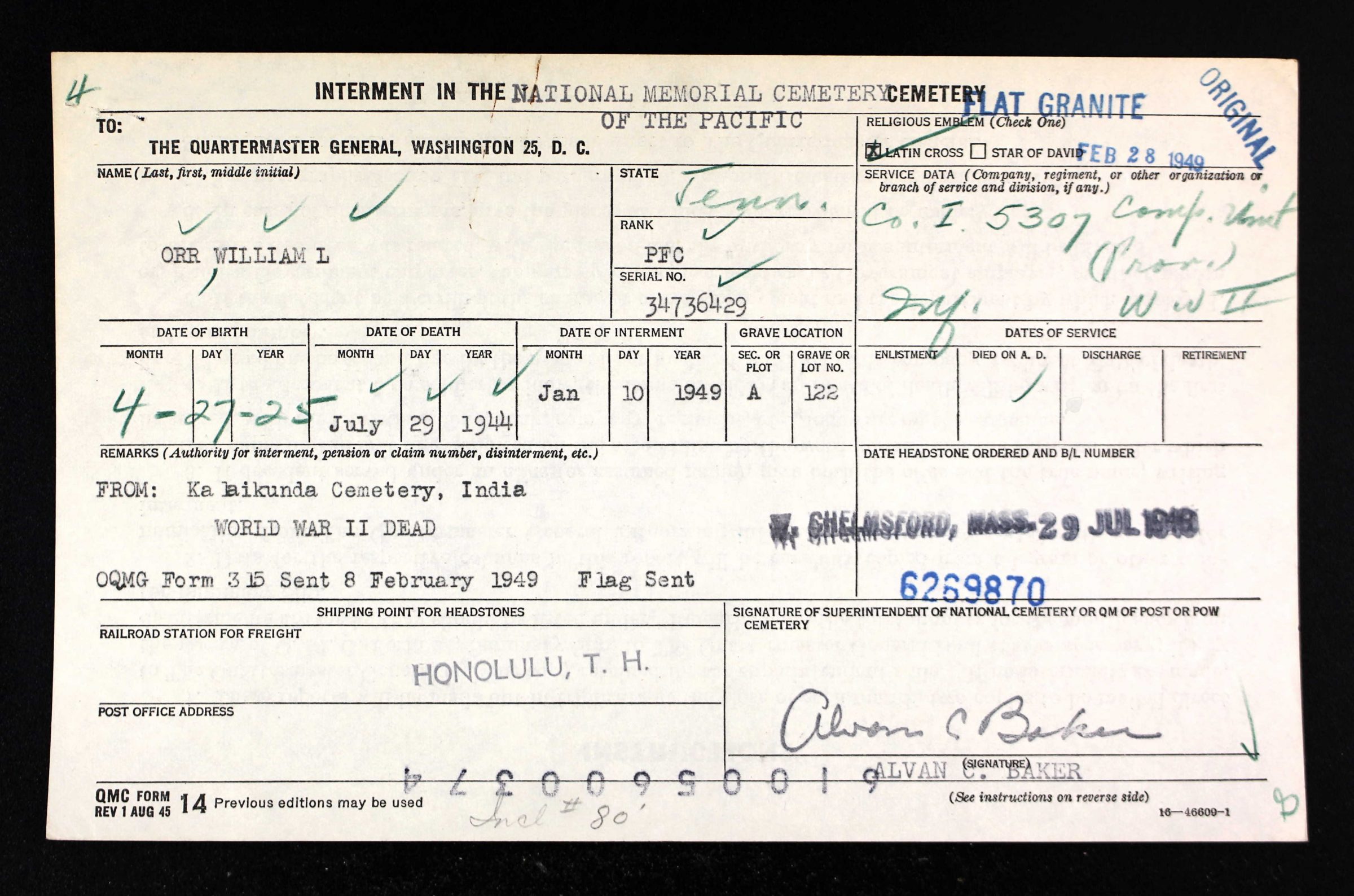 PFC Orr was initially buried at Kadaikunda Cemetery in India