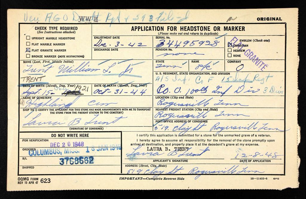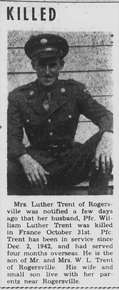 Mr. Luther Trent of Rogersville was notified a few days ago that her husband, Pfc. William Luther Trent was killed in France October 31st. Pfc. Trent has been in service since Dec. 2, 1942, and had served four months overseas. He is the son of Mr. and Mrs. W.L. Trent of Rogersville. His wife and small son live with her parents near Rogersville.