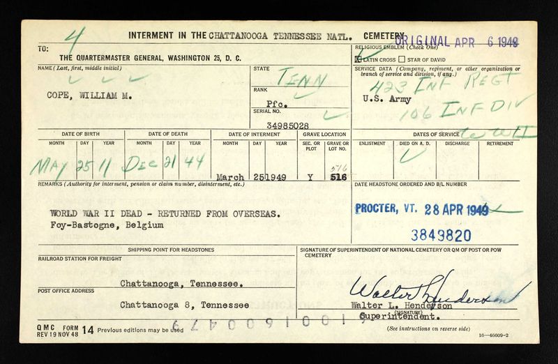 Died 21 December 1944 in Belgium. PFC Cope was returned from Foy-Bastogne, Belgium