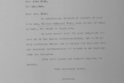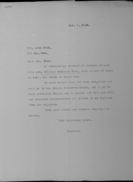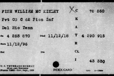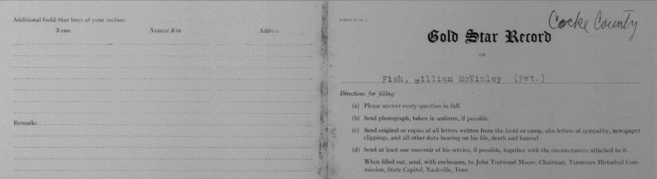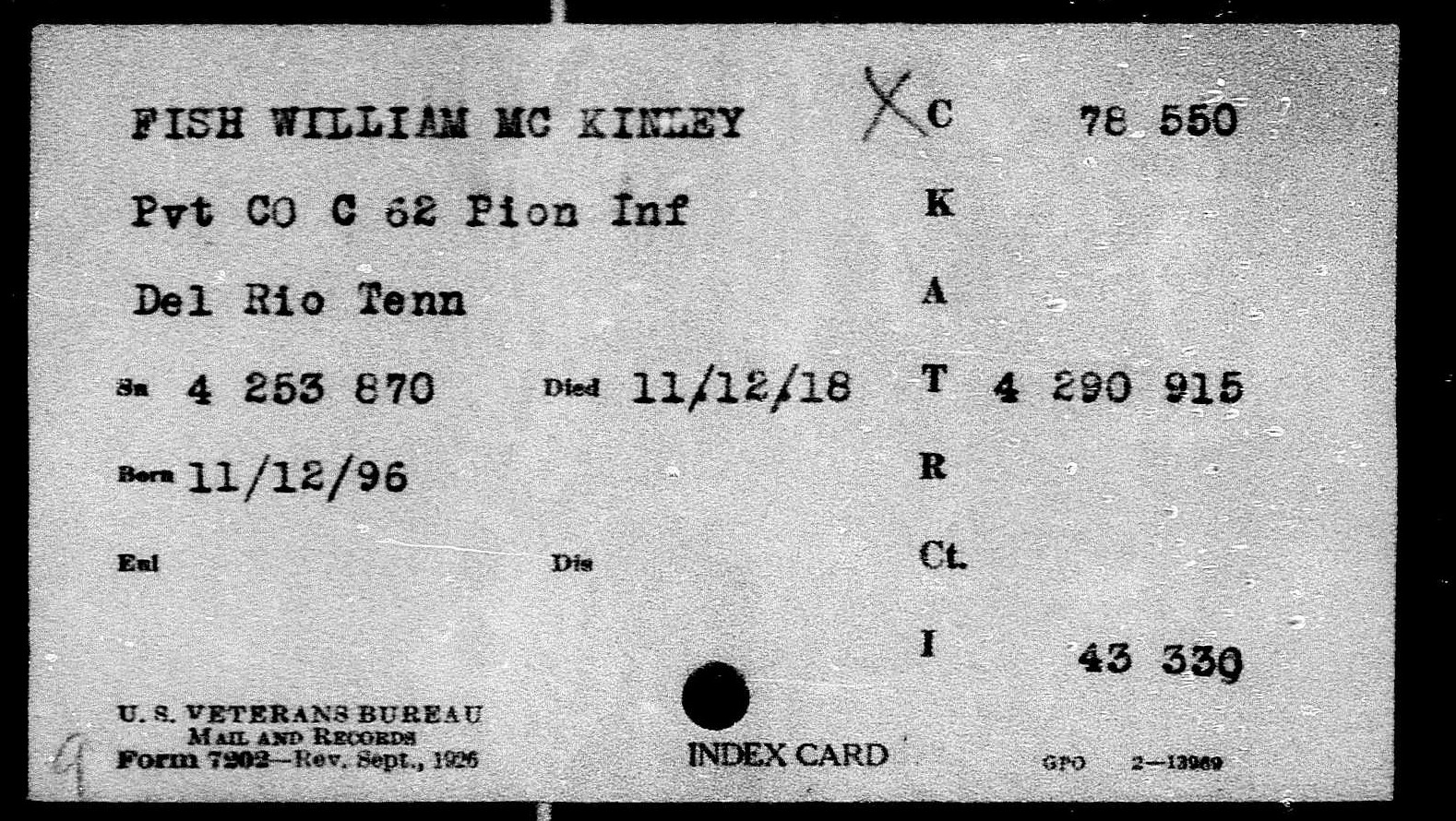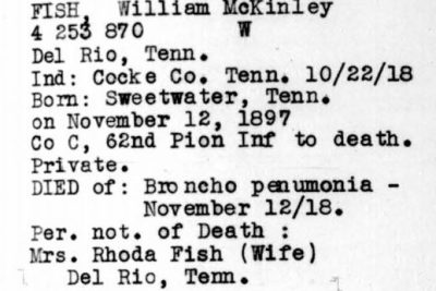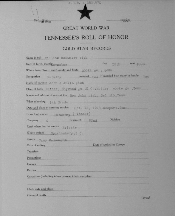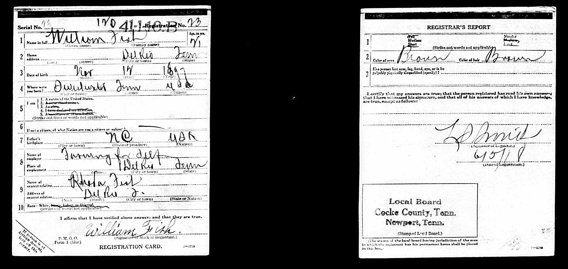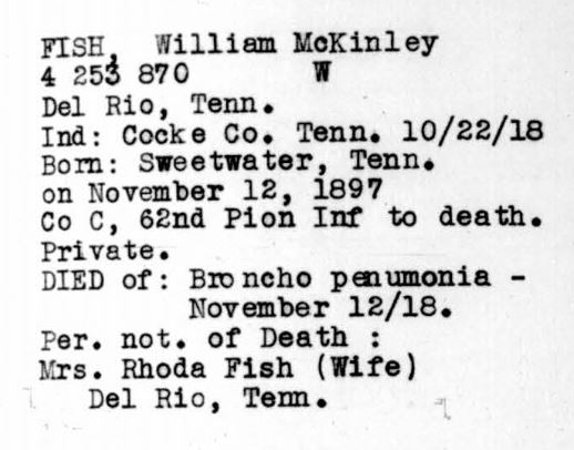 William McKinley Fish was born in 1896 in Sweetwater, Tennessee. He was the son of John Fish and Julia Bellen Mantooth Burke. Husband of Rhoda Rilla Pack and father of Carl William Fish.